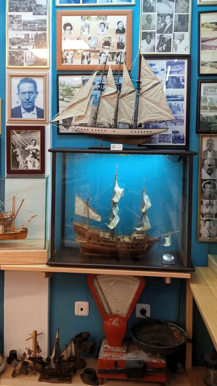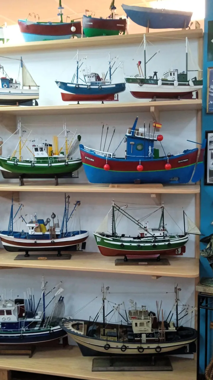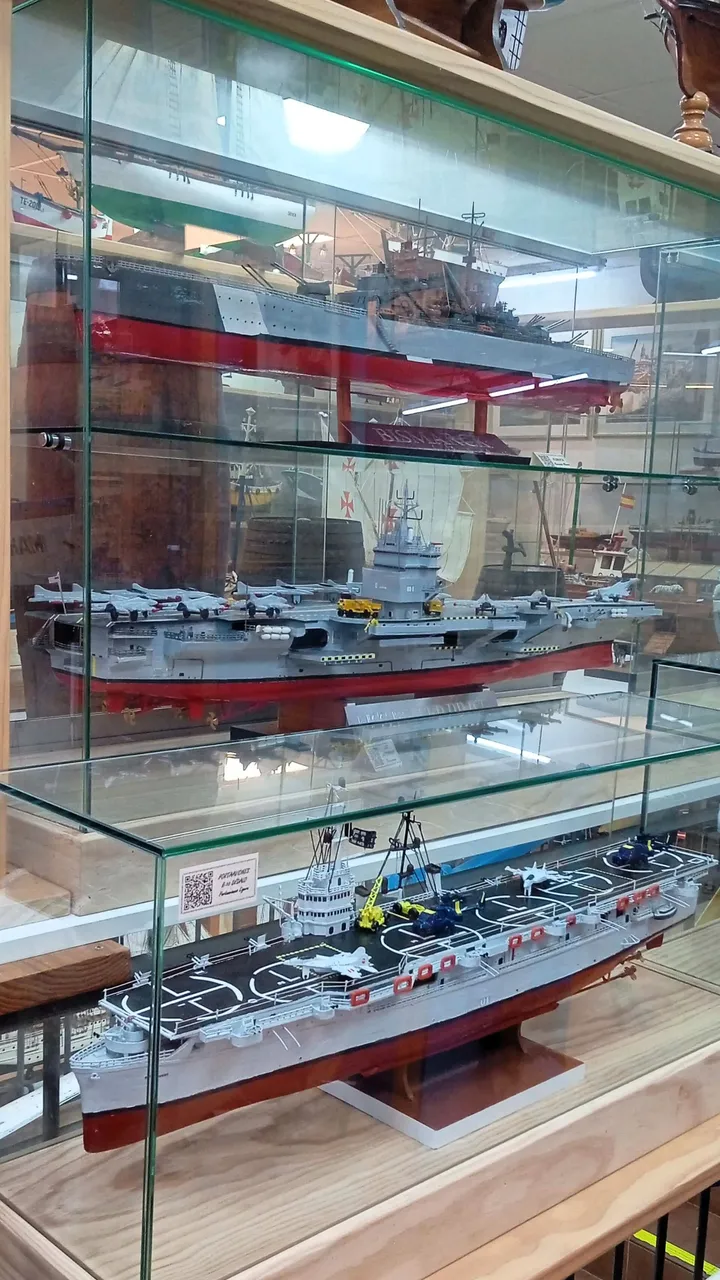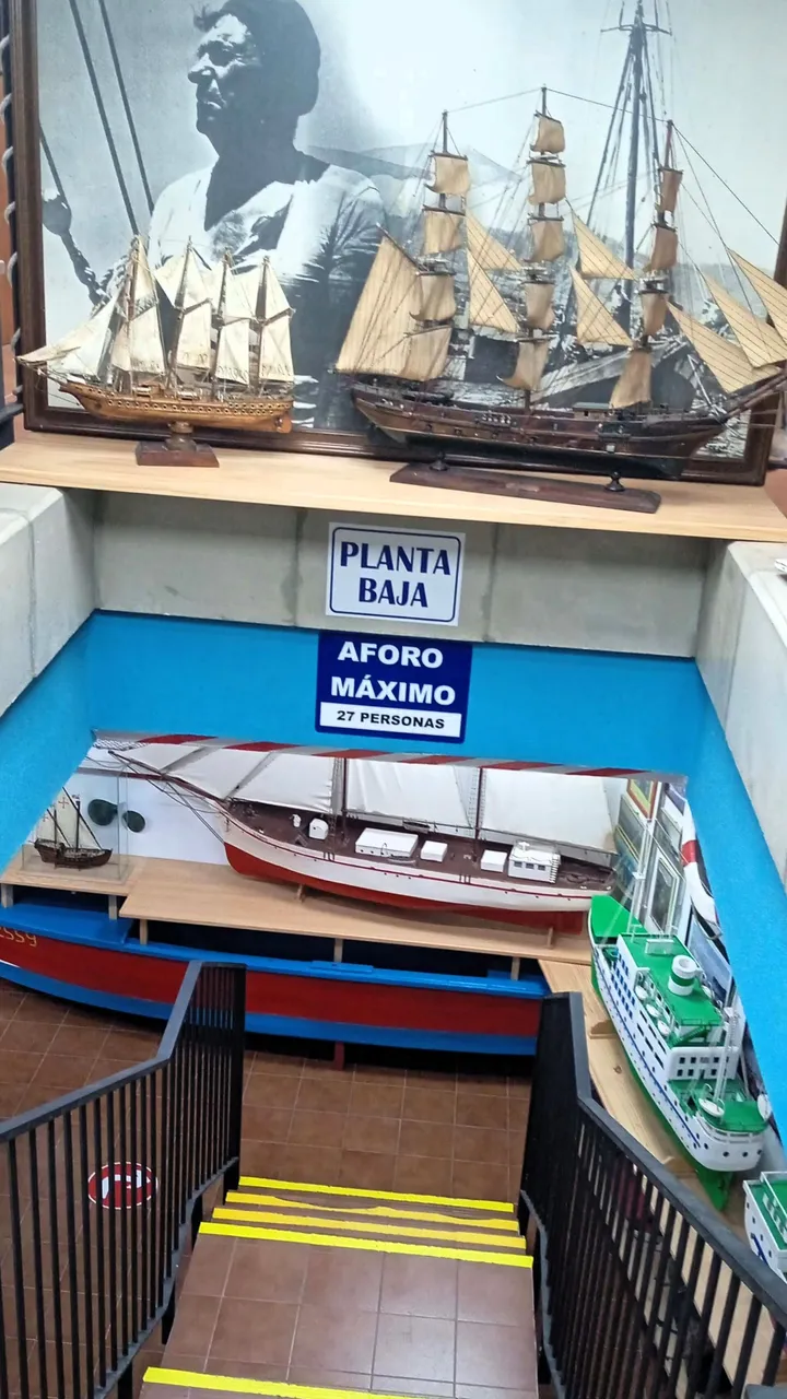 This museum not only displays small-scale models of ships but also real artifacts used on old and not-so-old ships, medals, paintings, ornaments, and even sea shells. You can find all kinds of ships, though perhaps not so many warships. As you can see, there are not only small fishing boats (launches), but models of large ships, some old and some not so old. The museum has two levels, the second level is below and is accessed through a central staircase that is oriented in the opposite direction to the entrance of the museum. Something quite curious is the presence of a model that refers to Noah's Ark and several animals inside it. This model is located just above the staircase.