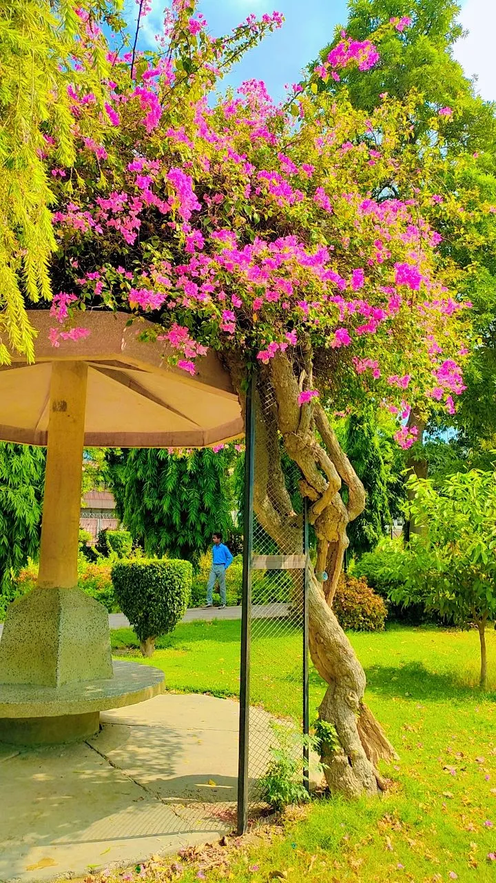 A little bit later, there was a different tree, which looked very different from all the other trees and looked very beautiful. It had all pink flowers on it. I liked it very much, so I A picture was made of it. By seeing the natural sights, one's heart becomes very happy and one's worries disappear completely.