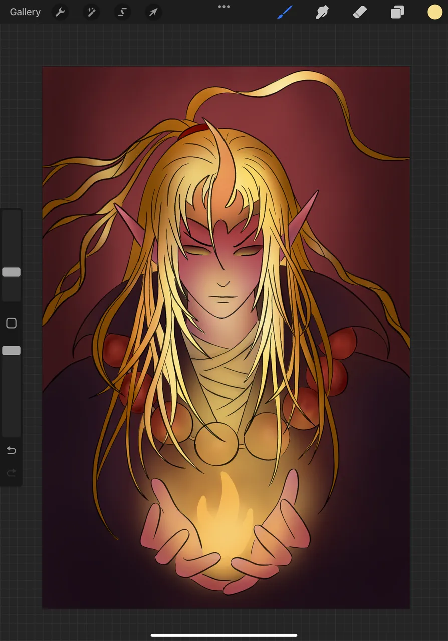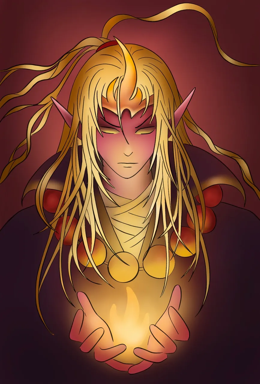 Since he's the fire caller, I decided to have him conjure some sort of fireball in his hands and draw him a fire in his hands. And if fire is anything, it's a source of light and with lights, comes glows and shades for me :D