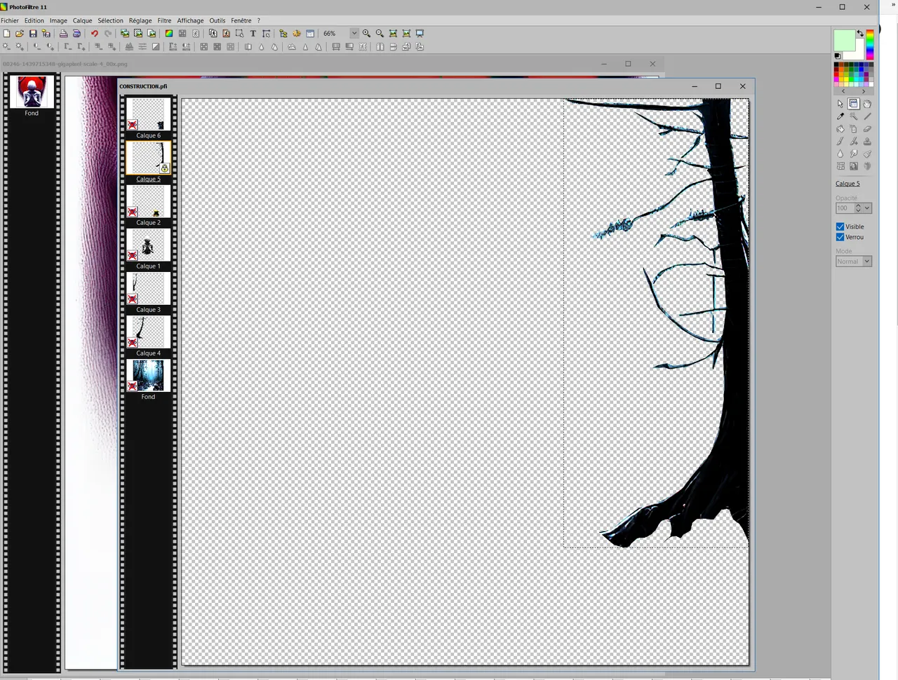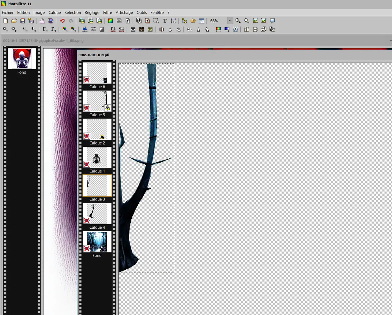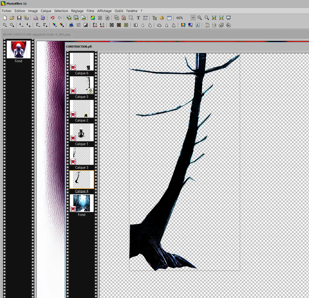 The 6 images that follow are my cutouts to create my movements. I specify that my software only offers me 4 positions of situation in the image and during the creation I had to modify its position to make the tree or another object in front or behind the spectrum