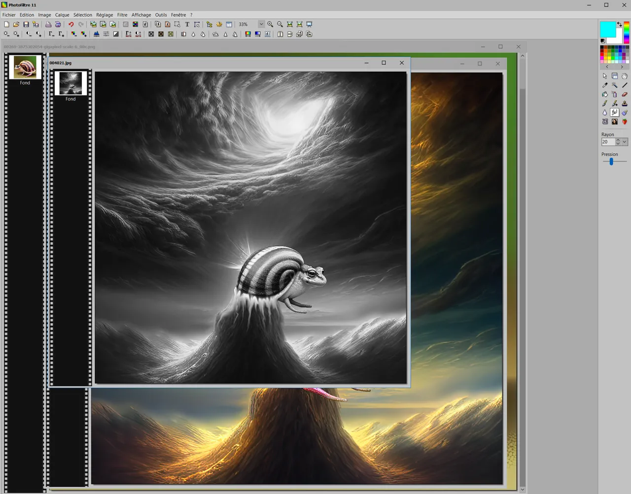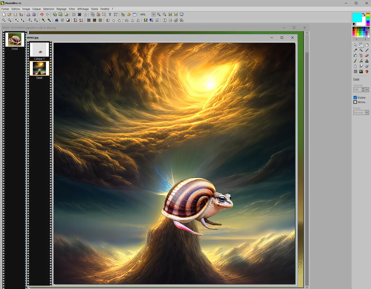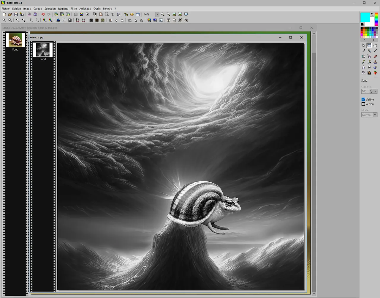 I cut out my snail toad to attach it to my background image. With broken glasses, in the fog, one night illuminated by a moon in the first quarter, I realized that it roughly resembled a turtle hahaha.