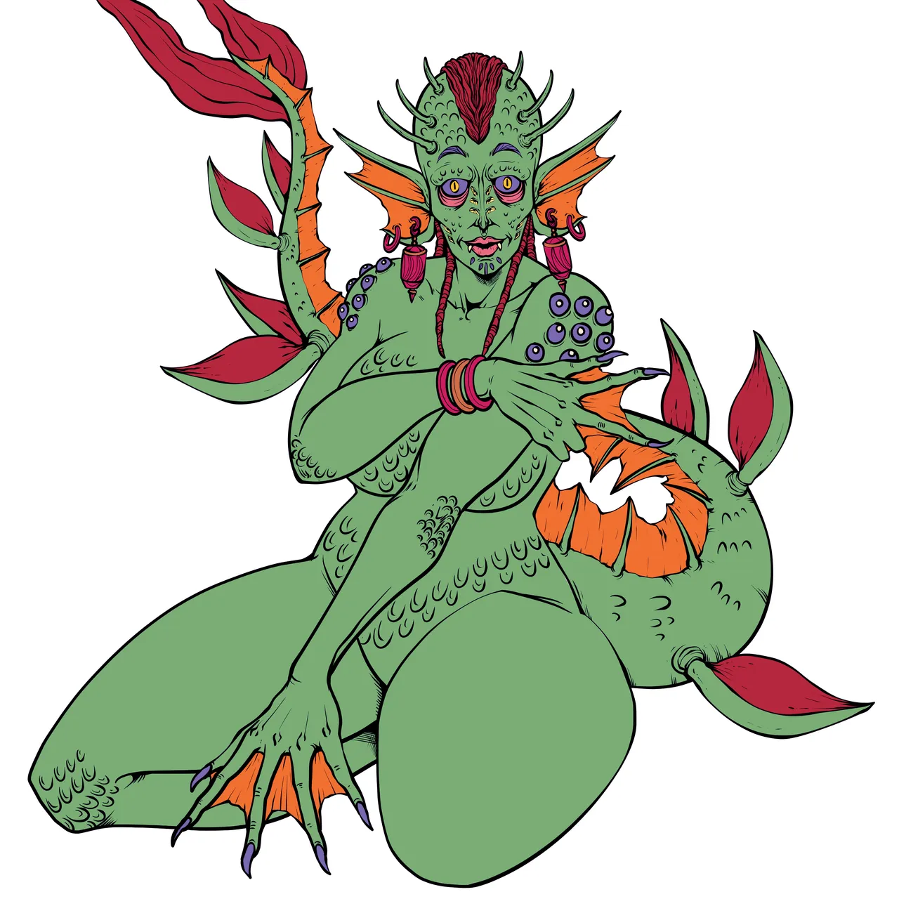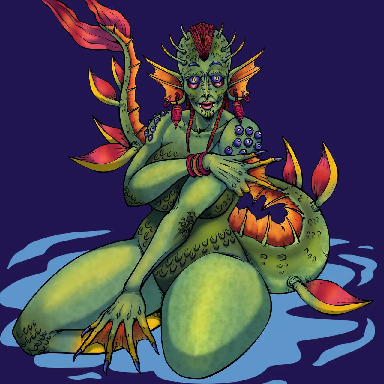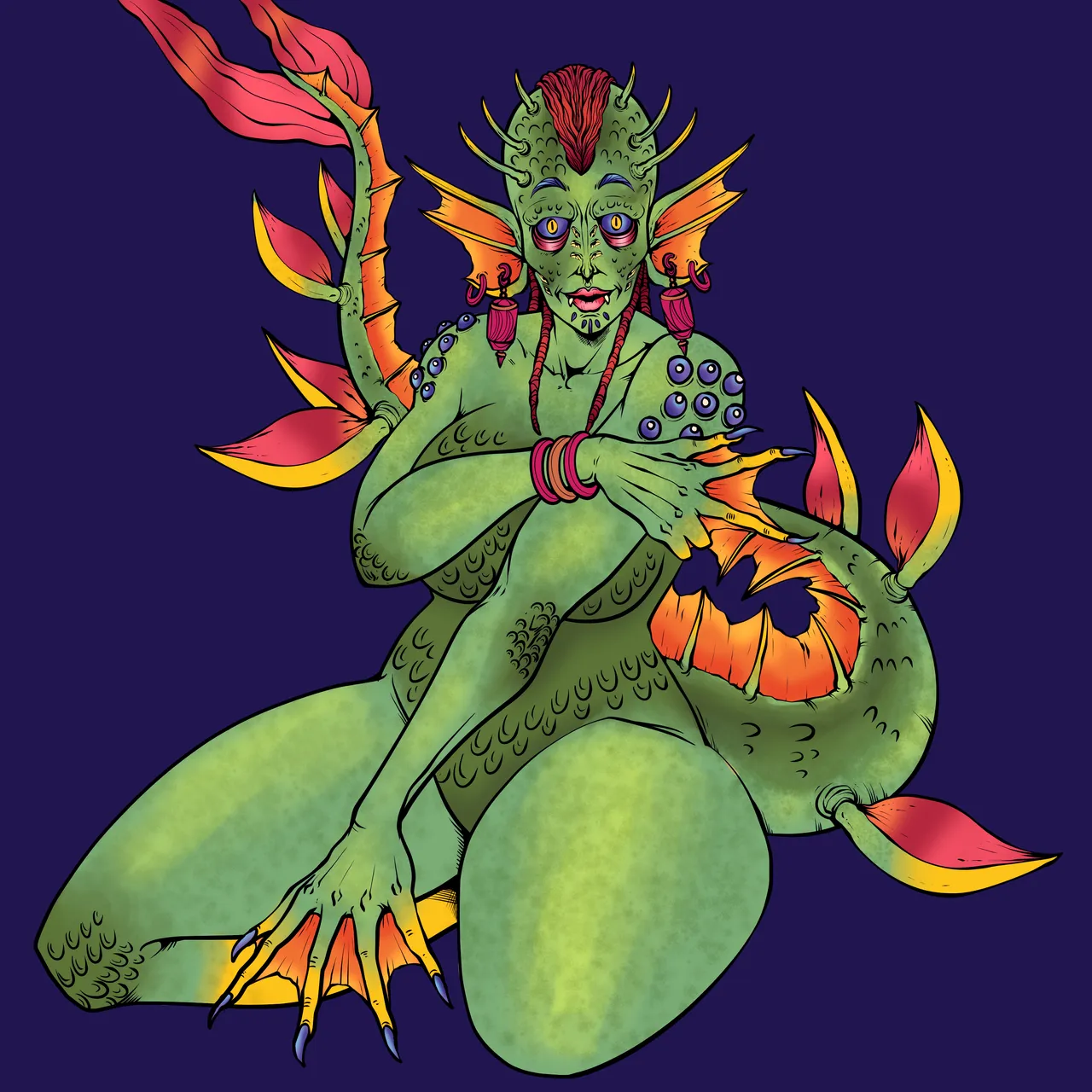 From the results of the cloning, a human-like creature emerged in the form of a woman with green skin and scales on her body and a tail like a dragon's.