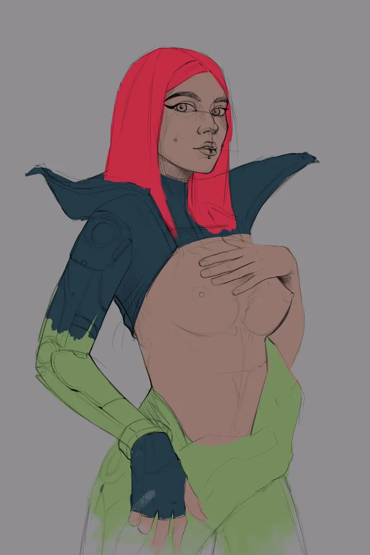 And finally comes the really cyberpunk, the mechanical arm, here was where I looked for the brightest colors that the color circle could give me and I applied them without compassion to that metallic texture, but at the same time I combined it with some tones similar to her skin as if trying to show that at some point she tried to hide that her arm is not natural or what do I know. I also had this large area of empty skin right on the girl's abdomen that I didn't want to fill with futuristic or mechanical elements, so I opted for a tattoo, not one as defined as the ones I did for the Onis series of paintings, but with a quite attractive design.