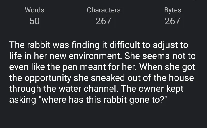 The rabbit was finding it difficult to adjust to life in her new environment. She seems not to even like the pen meant for her. When she got the opportunity she sneaked out of the house through the water channel. The owner kept asking "where has this rabbit gone to?"