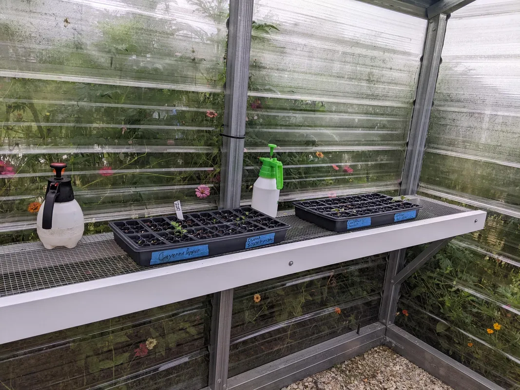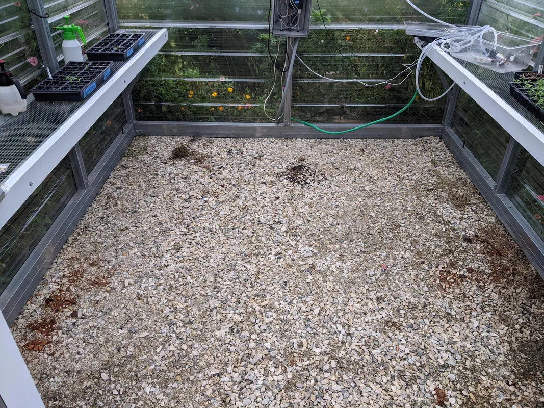When the green house was delivered it was placed on a foundation of gravel. This seems to be part of the problem, the rocks soak up any dropped water and then it soaks down further into the earth. Making the green house stay very dry. With RH levels in the 20% range I need to bump it up into the 50-60% for adult plants and 70% for seedlings.