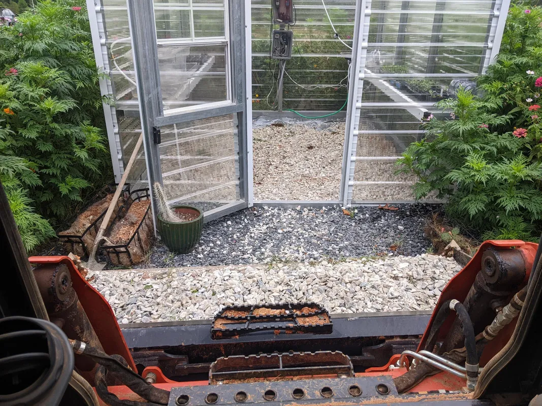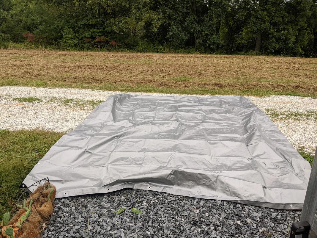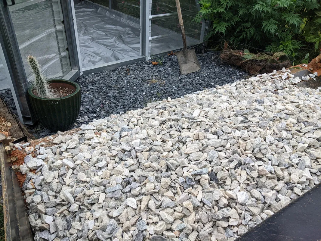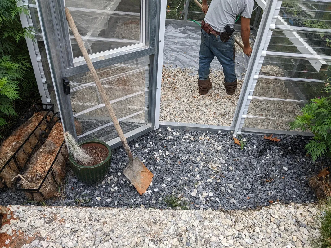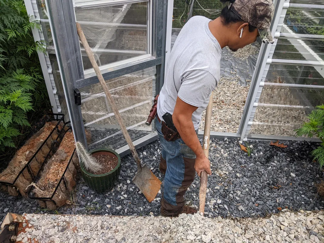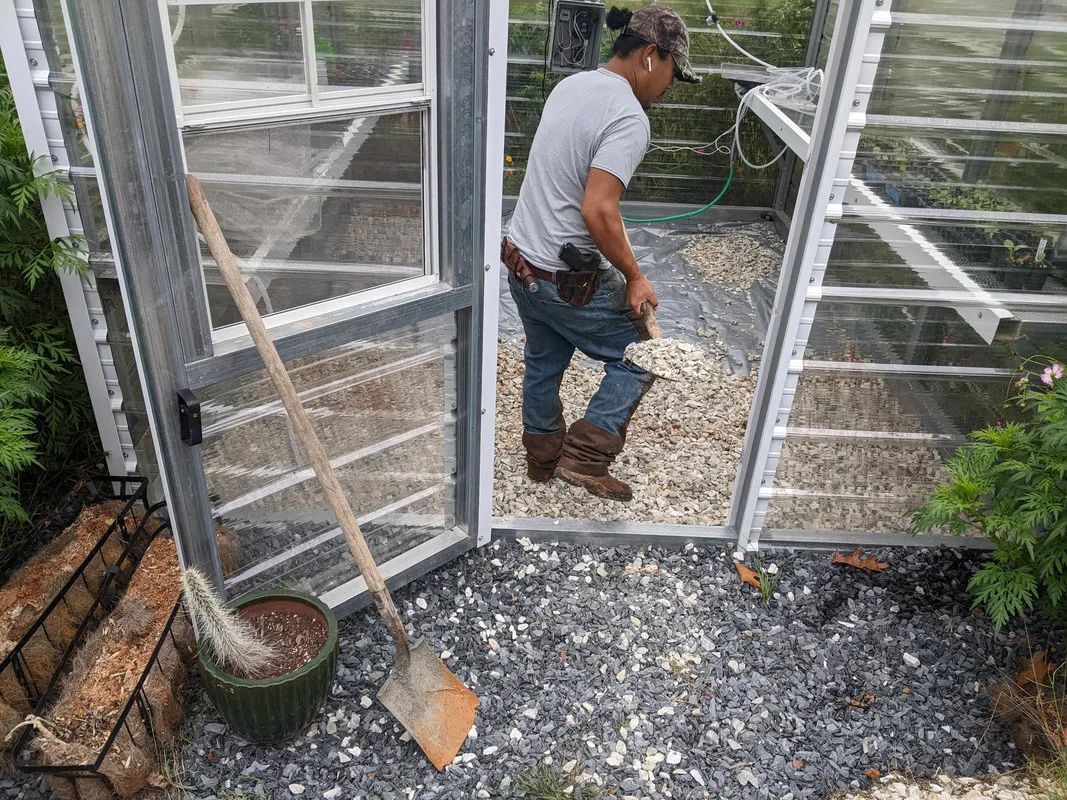 Now we need to add gravel, otherwise walking on the tarp it will rip eventually.