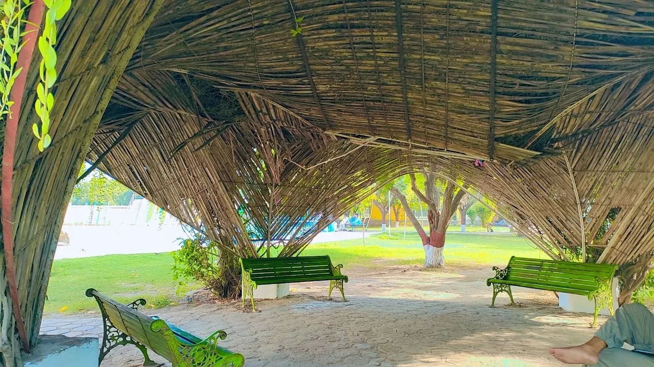The seating area was very elegantly designed with all wood work inside and all grass work on top of the tree which was the way it was. It was beautiful, beautiful benches were placed inside and people were sitting there.