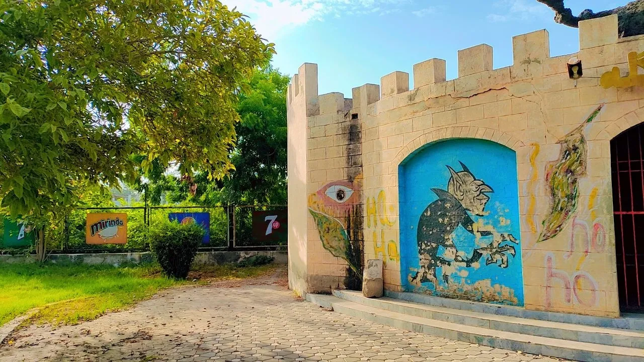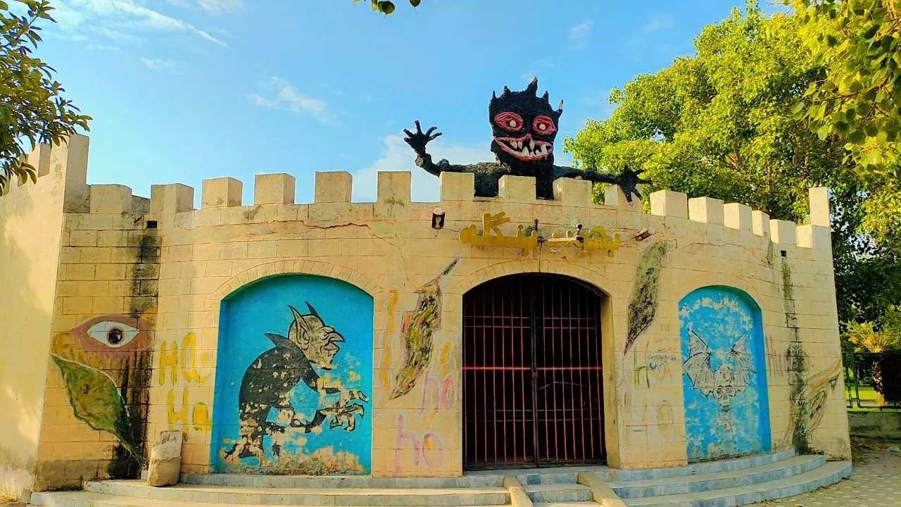 There were very beautiful paintings on the wall and the name of this place was bhoot bungalow. People who were inside came to scare people by making different types of shapes, so this place was very fun.