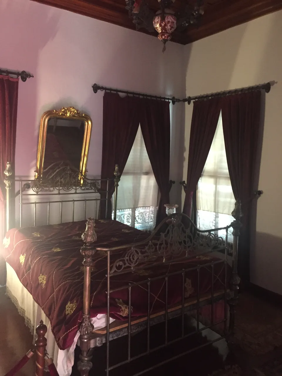This room is Atatürk's bedroom. There is a closet in the other part of the room. Did you notice the moon and star on the head of the bed?