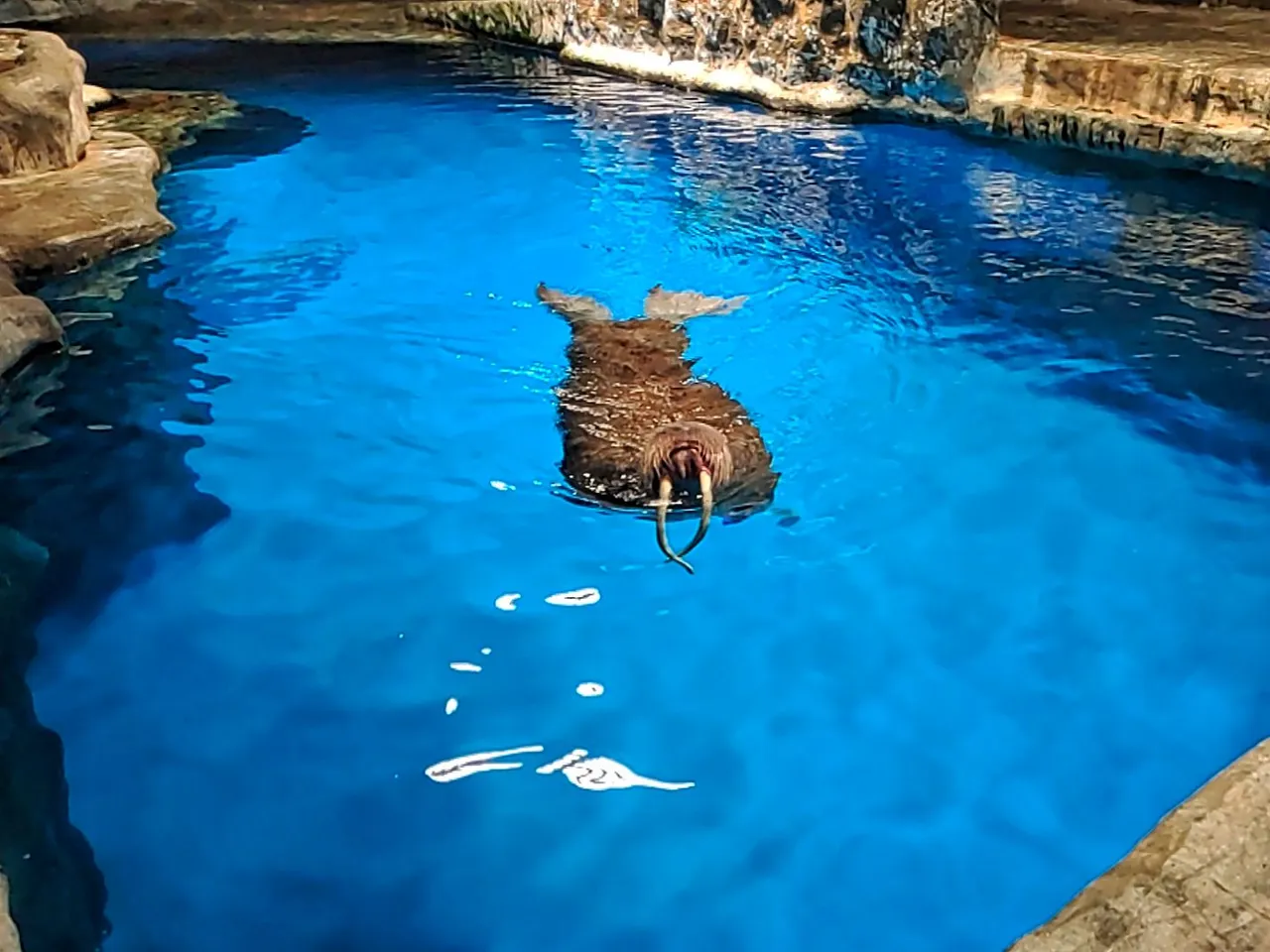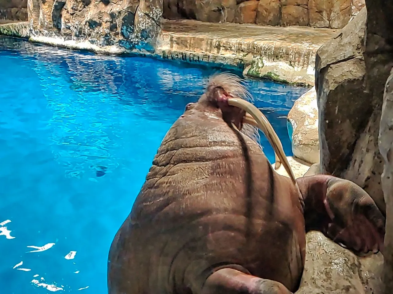 There is an interactive place down the rock formations with two openings on top covered with glasses. It allows visitors to interact closely with the walruses. However, it seems pretty useless as they don't go near it.
