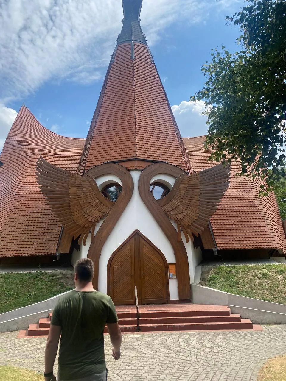 The church that you can see in the photo, its architecture represents life overcoming death, with one of the main materials being wood; The church is also called "Christ's Ship" because of its shape, which points in four directions with four separate entrances. The main entrance is decorated with angel wings to protect the people entering. At the top of the tower is a tree of life with a cross representing the victory of life over death.