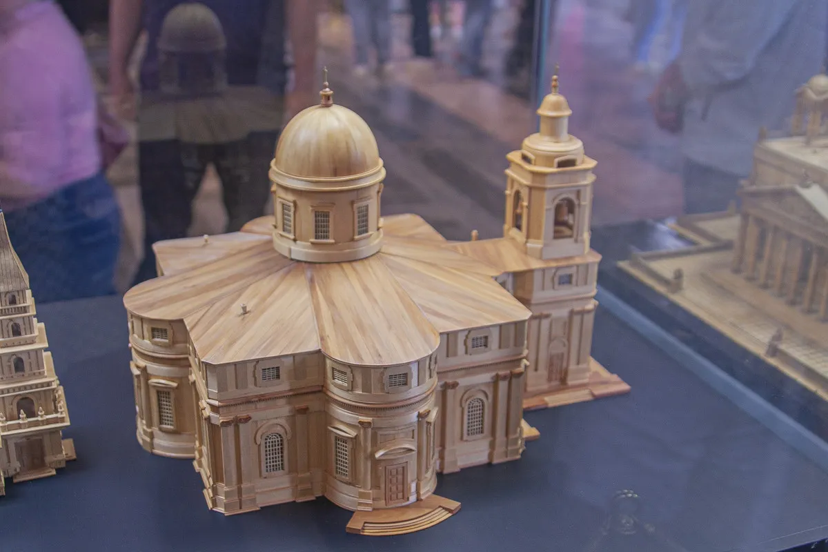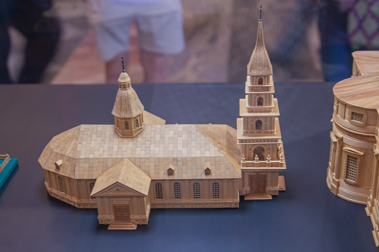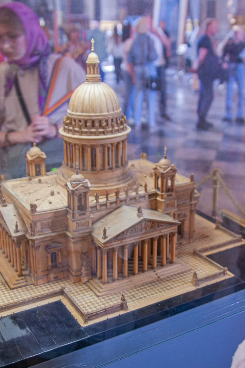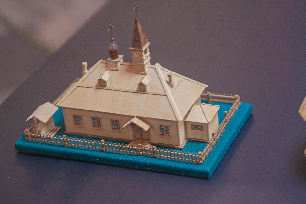 At the very beginning of my publication, I placed four photographs in a row. These are wooden models in one of the showcases. The first photo shows the layout of the very first wooden church of St. Isaac of Zhalmat, which is the prototype of the future temple. Emperor Peter I was married in this church a long time ago.