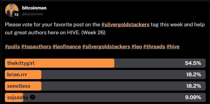 On behalf of the #silvergoldstackers community I would like to express our gratitude to everyone who has been involved in and supported the Stacker of the Week initiative so far. A special thank you goes to @leofinance, @ocd, @theycallmedan, and @blocktrades for their ongoing support. Your contributions are truly appreciated."