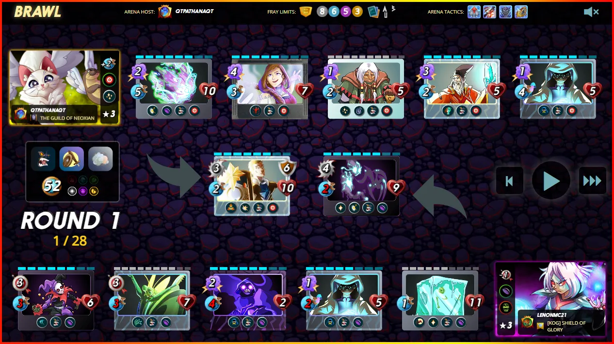 This was a very interesting battle, because, believe it or not, it was the first time I experienced a battle rule where we could only use "Neutrals" type cards, although it is not very complicated, I was surprised, however, seeing the available conditions and the amount of mana with which I could form my cards, I decided to play with my "Yodin Zaku", My opponent thought the same, but, unlike me, he didn't place much "Range" attack power, which allowed me to take the advantage, besides, playing with the only card that has "Tank Heal" in the "Splinter Neutral" of the whole game, allowed me to heal "Lord Arianthus" many times, giving me an important advantage and giving me the victory at the end.