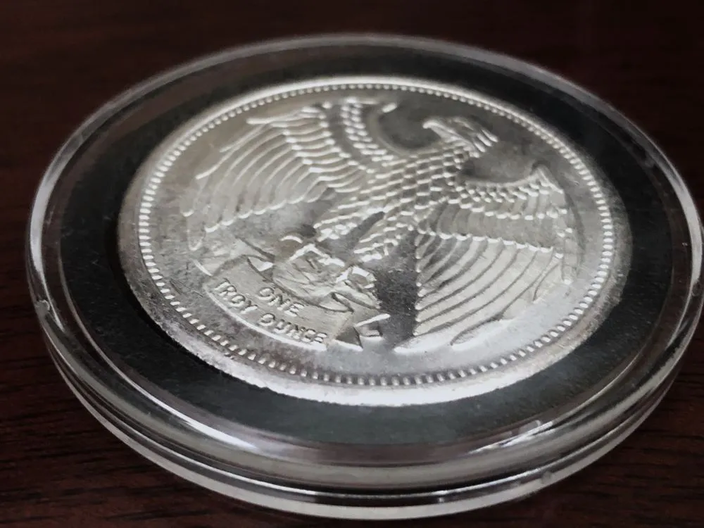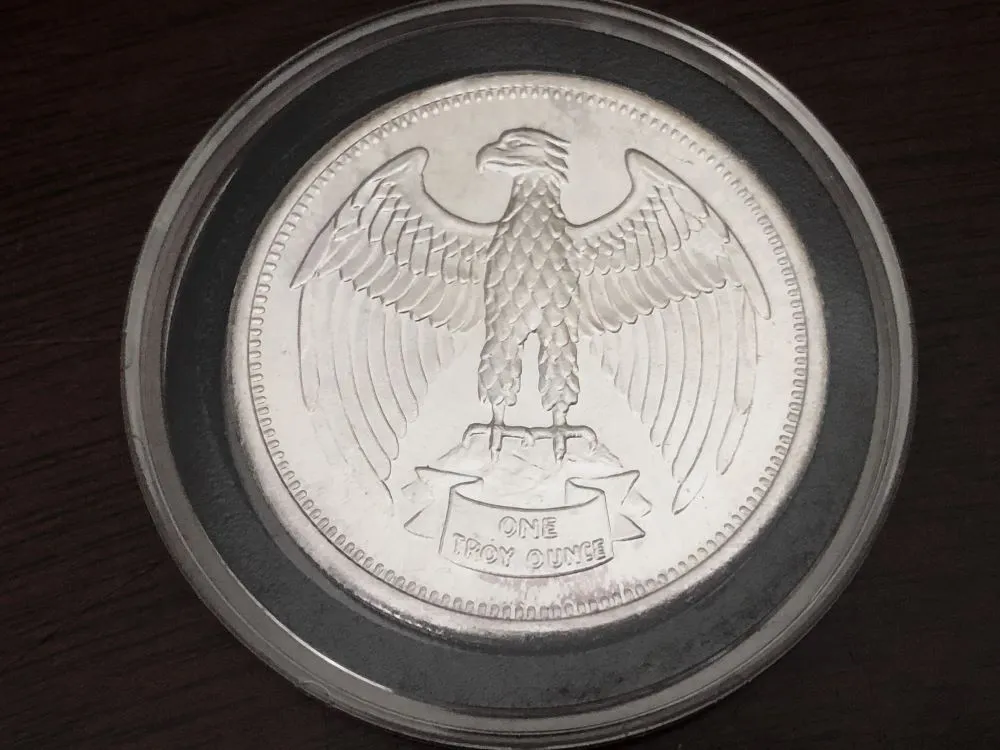 The focal point features a stylized heraldic eagle that bears resemblance to Letcher Mint's 1973 design. The words "ONE TROY OUNCE" are written in a box beneath the eagle. The Eagle depiction appears to have native American origins.1