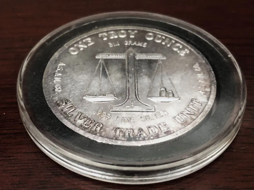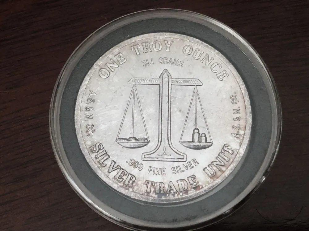 The mint mark "AS & M Co." appears on both sides of the main picture. ".999 FINE SILVER" is the purity listed directly beneath the scales. Just below the purity inscription, on the outside circle, is the phrase "SILVER TRADE UNIT".