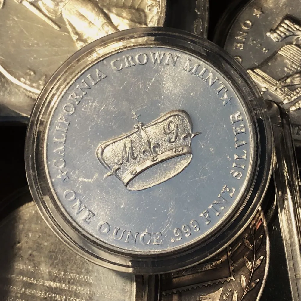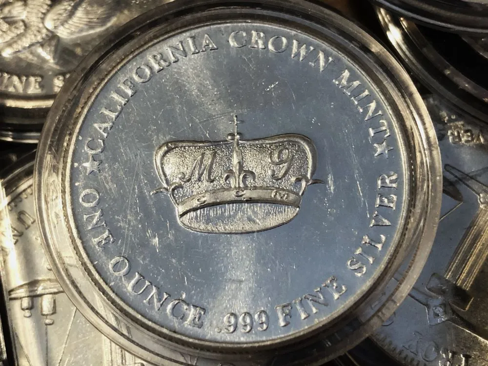 Above the crown is the name of the mint "CALIFORNIA CROWN MINT* and weight and purity "ONE OUNCE .999 FINE SILVER" inscribed below.