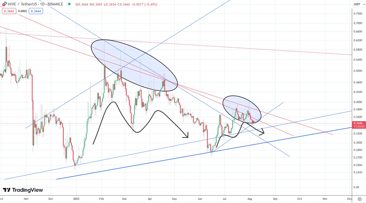 Hive broke out of the major macro resistance several weeks ago and has now retested it. Essentially, it is now a support - together with the bottom support we have a double support as well as a potentially higher low.