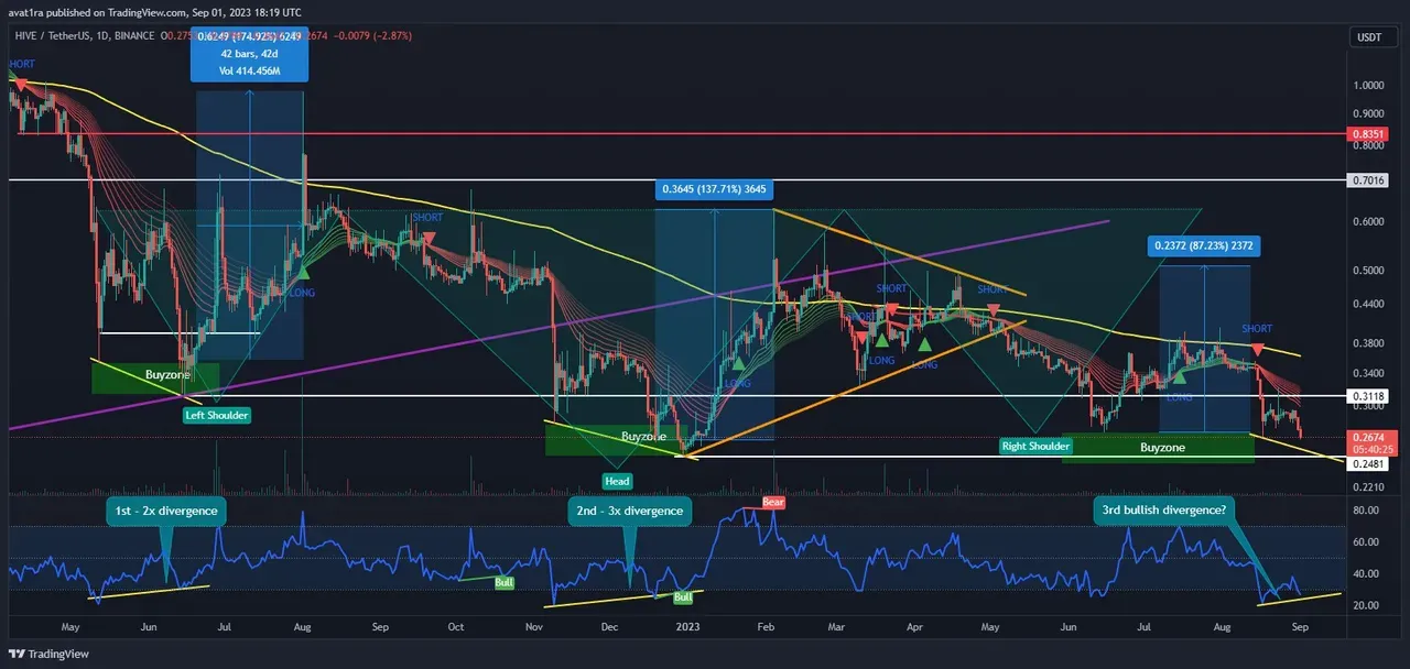 If so, we could expect price to rise continually - normally Hive makes a higher high every day for a week or two before price crashes again. But, as I said this time I fell could be different since we are about to encounter the macro resistance going all the way back to the ATH at around $3.4. Price generally "explodes" when it breaks such a resistance. There are two obvious ones (here marked in red):