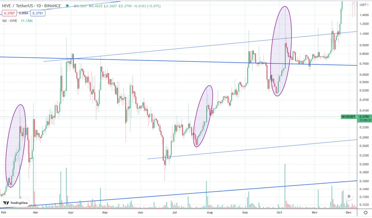 While not completely confirmed until we make a higher low after a bigger correction it seems that this is at the very least a relief rally. Hive has been going up lately with one green candle after another. Just last week I was predicting a possible pump to about 60 cents and so far we got one going up to 46. But the interesting part is that price is not falling (yet) and keeps on continuing making green candles.
