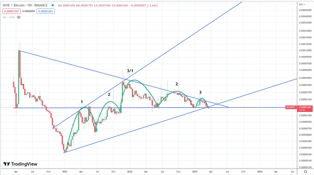 3 weeks ago we last looked at this pair, and it did not look to good for Hive. But looking at the chart again made me realize that I probably made a mistake in the last analysis. It is not that great, but I think it's enough to warrant an update. My main idea still holds: we can see a strong 3 wave pattern in the chart.