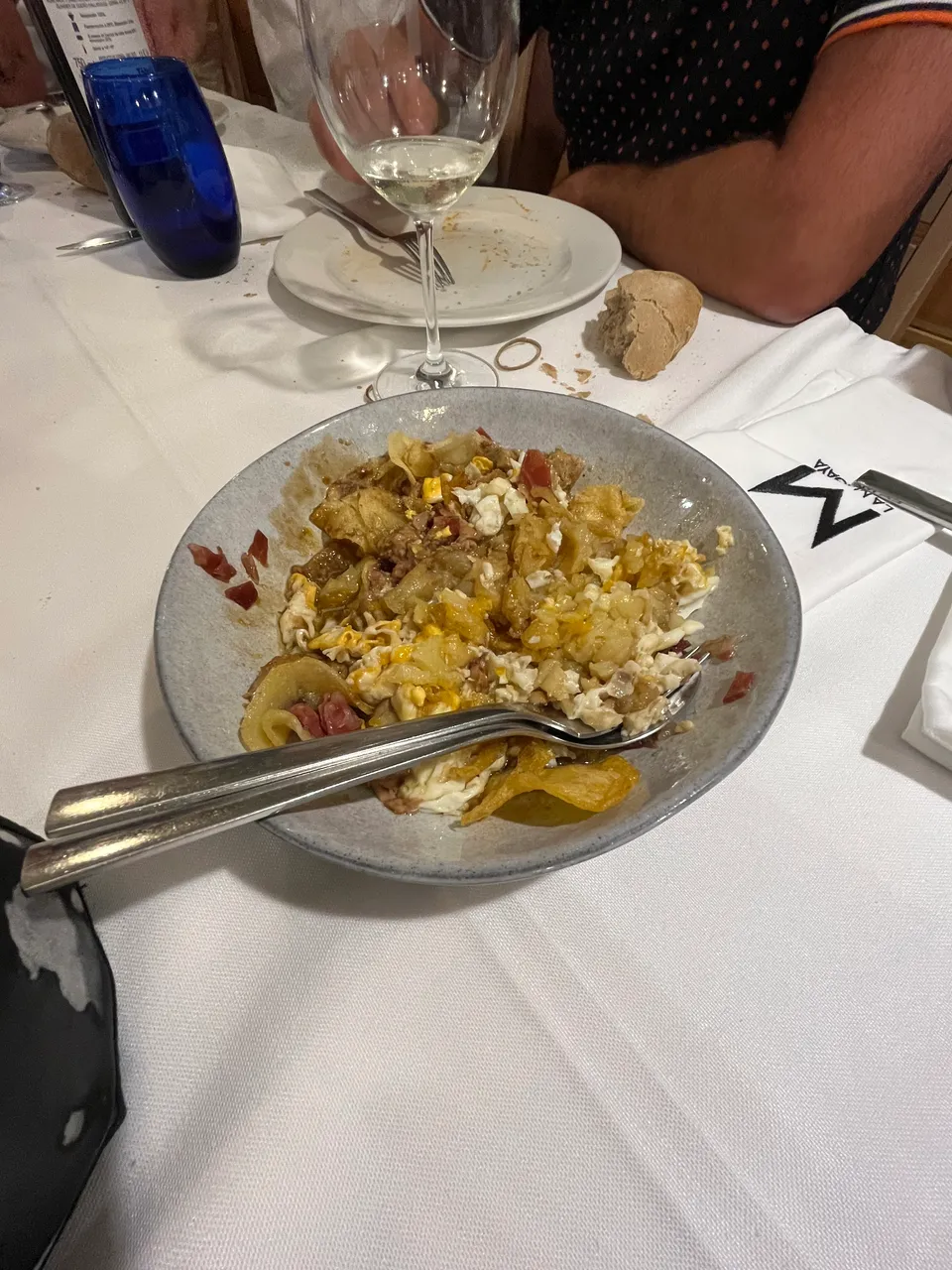 A simple dish based on fried potato, fried eggs, ham and duck foie that when you break it all together and the mixture intensifies the flavours that each component has separately.