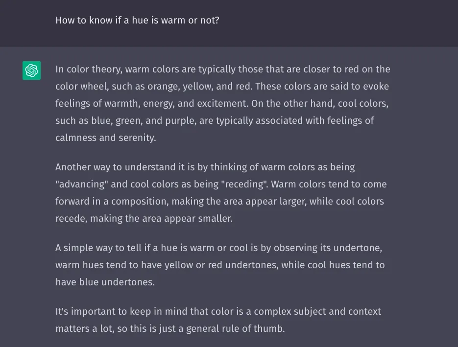 ChatGPT: In color theory, warm colors are typically those that are closer to red on the color wheel, such as orange, yellow, and red. These colors are said to evoke feelings of warmth, energy, and excitement.