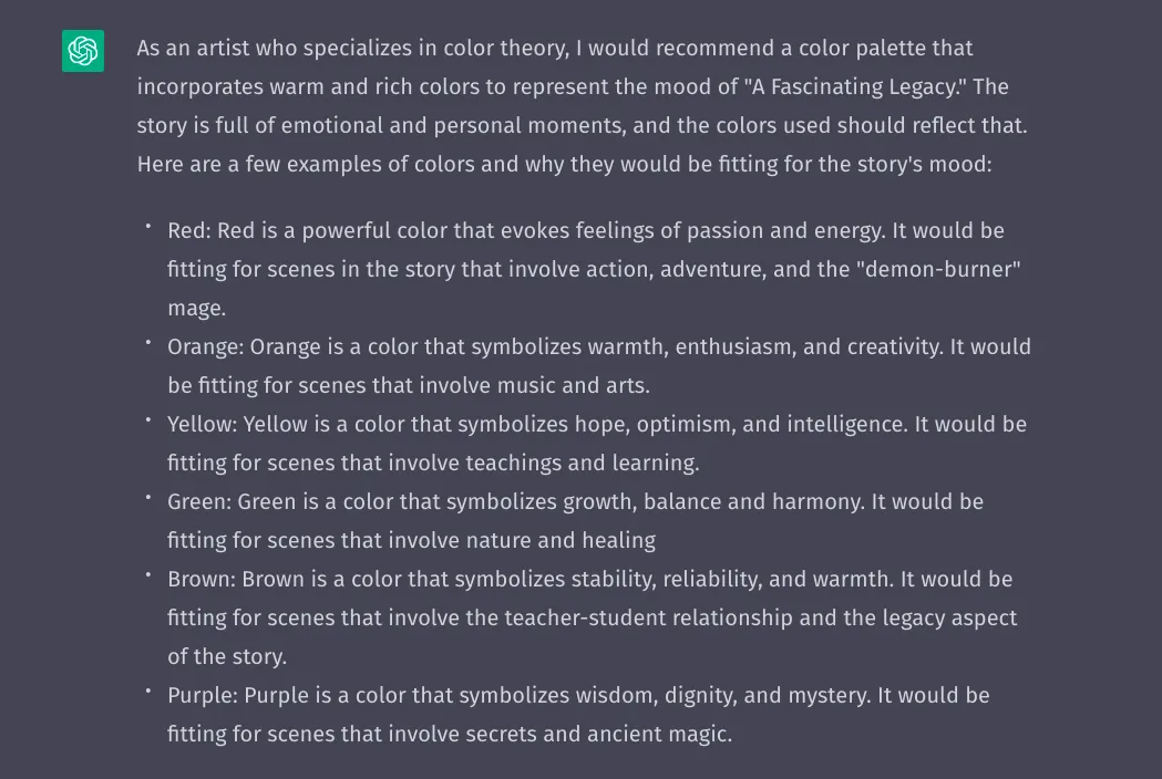 ChatGPT gave a wordy response, with extreme detail about the mood of the story and which colors are fit for which mood. It adviced me to use Rich and Warm colors. Red, Orange, Yellow, Green and Brown.