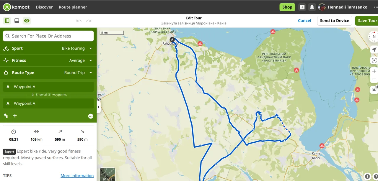 Останні роки для планування я користуюся програмою Komoot. Вона є як для Android, так і для iPhone, а також є вебверсія. Такий вибір ще й продиктований тим, що вона повністю сумісна з додатком мого велокомп'ютера і мені варто тільки обрати потрібний маршрут у цій програмі та натиснути "відправити на велокомп'ютер". На місцевості я орієнтуюся досить добре, але навігатор додає зручності та економить час у подорожі.
