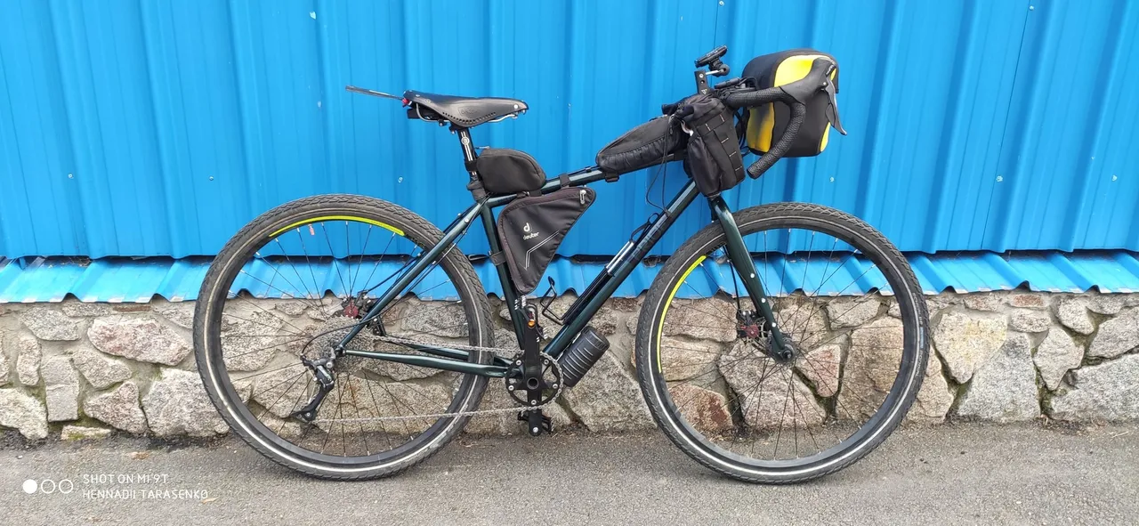 In the beginning, my bike was a Pride Rocx 8.2, which is produced by our Ukrainian company. If I may say, it was a kind of adventure bike that I rode for several years. In general, I was satisfied with it, but at some point I decided to change the frame from aluminum to chrome molybdenum, so I bought a Pride Rocx Touring bike frame.My previous bike was a donor. And then, over time, he made a few more upgrades, which left about half of the previous bike gone. Bags are also quite a separate topic, because I have tried a lot of them (my friends even joke about me "Oh, you have a new bag?!"). For some time I traveled with a bike bag, and classically separate bags, and also spent some time with bikepacking. Now I have a collection of everything I liked during these experiments. Also, a lot depends on what time of year I'm traveling and where I'm going. In general, it depends on the number of things I need to take with me.