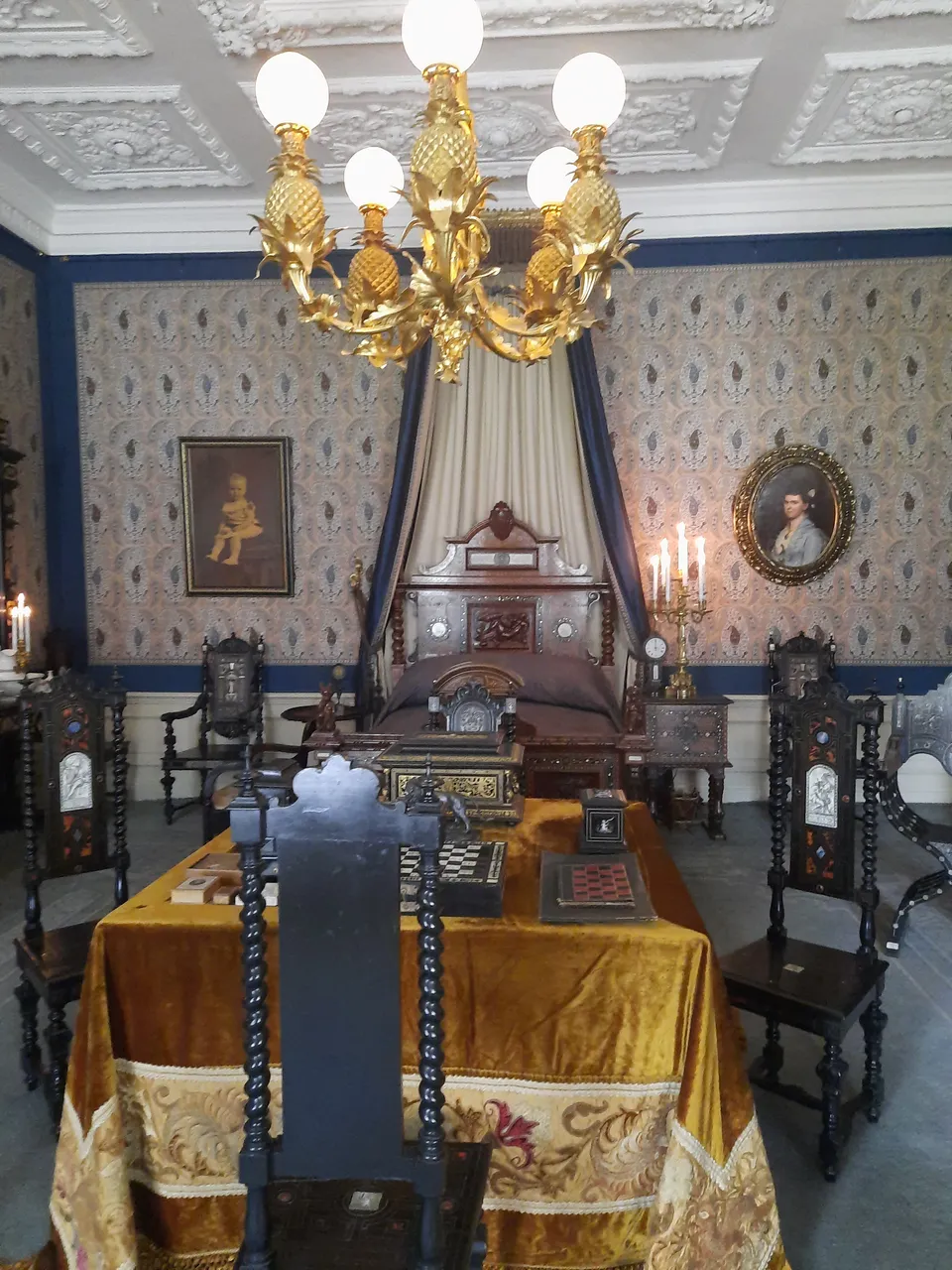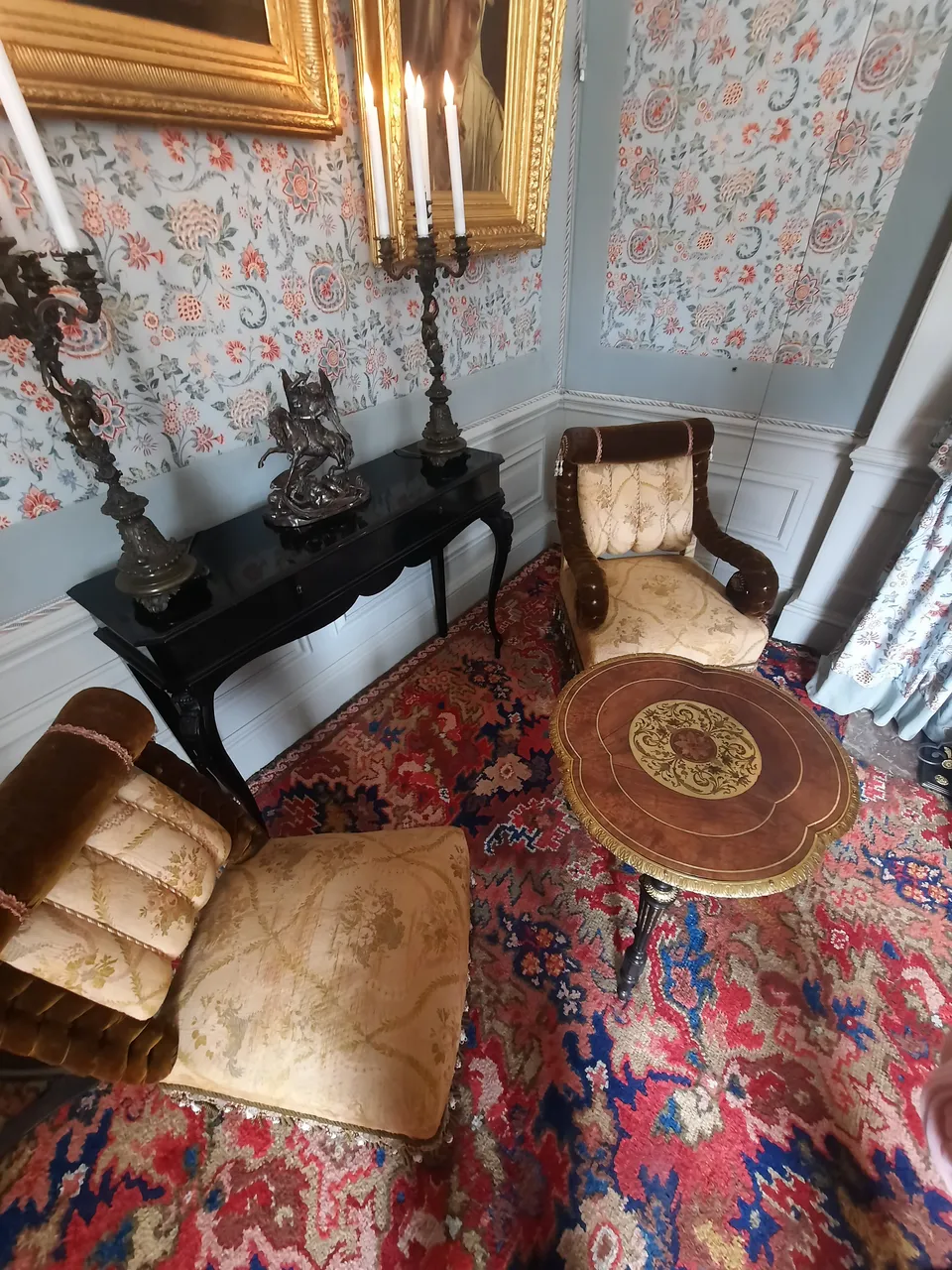 Everything around breathes luxury and centuries-old nobility. Each room is very beautiful in its own way. Everything is tastefully furnished, everything is harmoniously combined: wallpaper, heavy wooden furniture, upholstery, paintings, portraits.