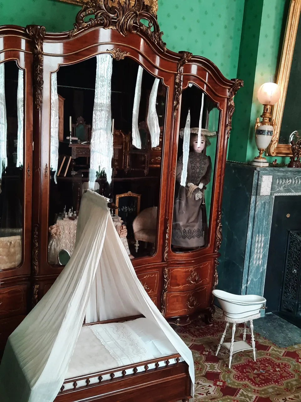 In a large lacquered wardrobe, behind glass, there is a doll. She is dressed in the fashion of the time and looks like a real princess. Next to the wardrobe there is a bed with a white canopy hanging over it. Apparently, little Queen Wilhelmina used to rock her dolls in it. And next to it is a tiny bathtub to bathe these dolls.
