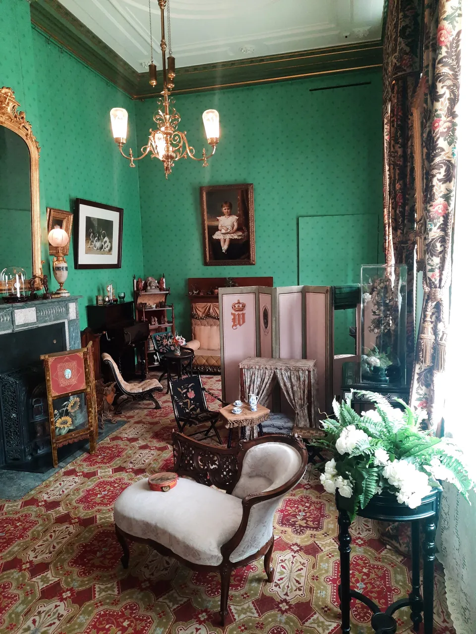 There is a small sofa with a curved armrest, which must have been used by Wilhelmina to rest. A portrait of the little queen hangs on the wall. It is very beautiful. The artist has successfully conveyed the child's carelessness and sincerity. Little Wilhelmina is holding a rabbit. This is the queen's pet, which is buried in the cemetery of the royal family's pets. It is located in the park, not far from the palace.