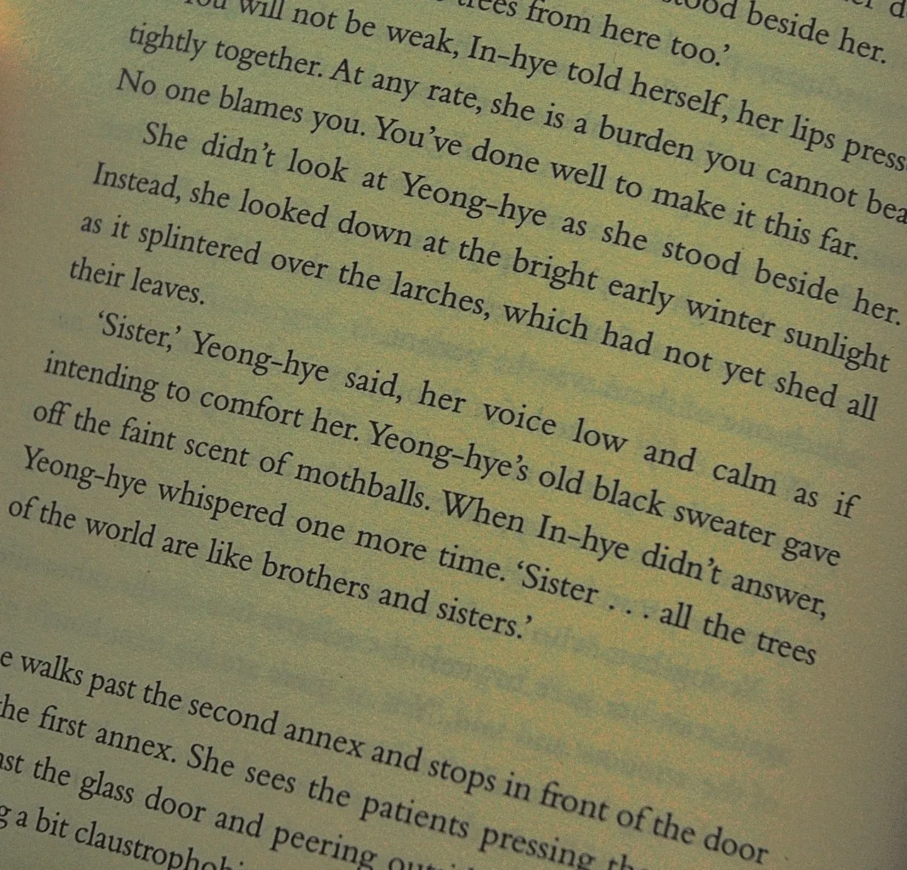The protagonist starts off by becoming vegetarian after a dream she had. Her lifestyle escalates and with that her mental health. I wish Han Kang could give us a small insight into Yeong-hye’s psyche. She does give little pieces in the form of Yeong-hye’s dreams, but other than that we see Yeong-hye’s psyche through her behaviour at a distance. From her throwing out meat at first to standing upside down on her hands to become a tree. It is as if Yeong-hye is terrified of herself being human and wants to become a literal tree. With this she acts like a child and become distant from reality. To see this escalation is interesting from a psychological point of view. This makes one want to dive deeper into Yeong-hye’s view of things. How she might see the world in her emotional isolation.