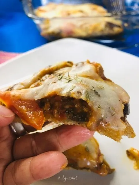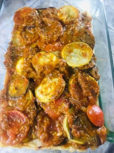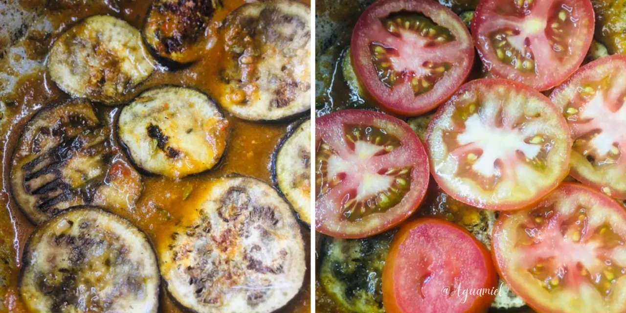 En un caldero agregamos un poco de la salsa y colocamos en forma circular las berenjenas, luego los tomates y calabacines, agregamos salsa, repitiendo el procedimiento. Llevamos a fuego medio para los vegetales condensando los sabores. Reservamos.