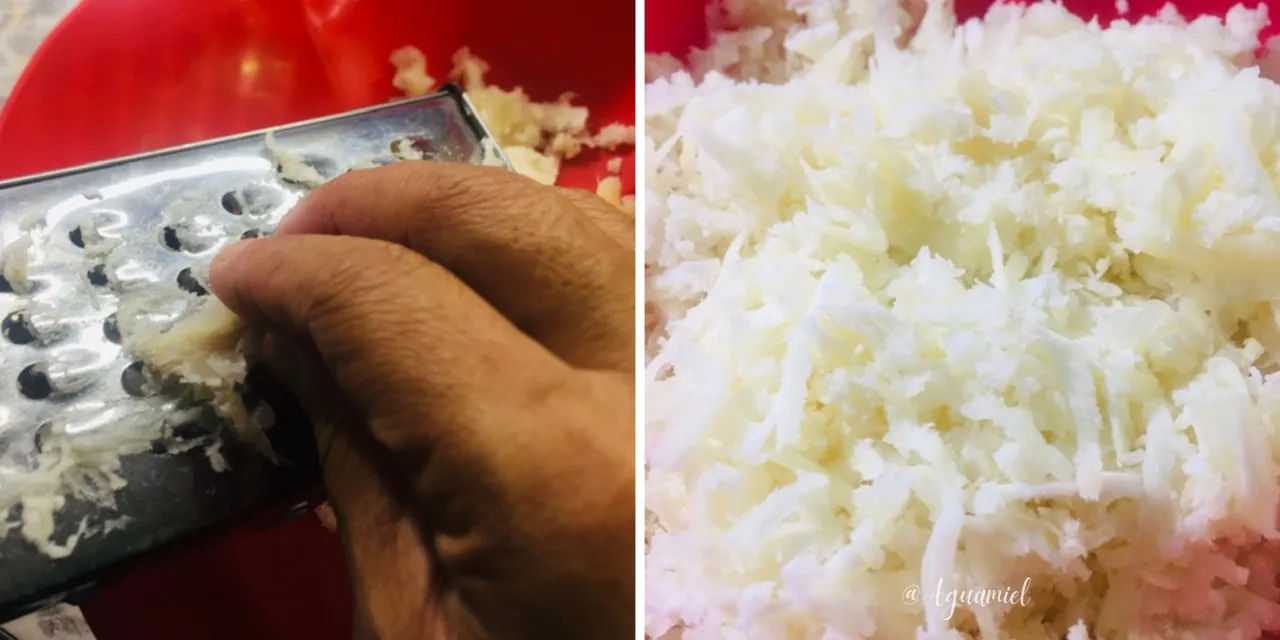 La yuca (mandioca) que tenemos reservada la rayamos por el lado más grueso.
