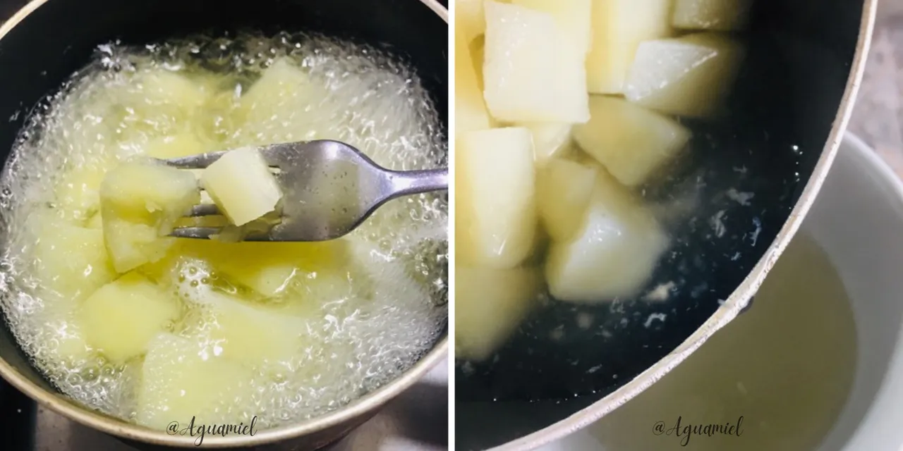 Verificamos las papas y las yucas cuando estén bien blanditas apagamos del fuego, colamos reservando el agua de la cocción -es importante tenerlo presente-