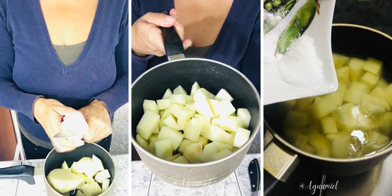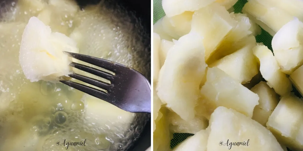 Pelamos la papa, cortamos en cuadros, en una olla con agua y sal llevamos a fuego hasta ablandar.