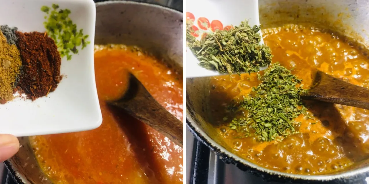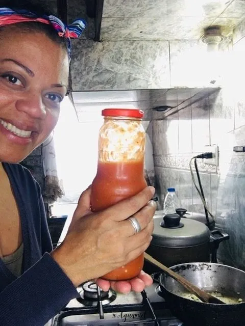 Agregamos al sofito una mezcla de tomate y pimentón que suelo tener en mi refrigerador. Añadimos las especies, soltando sus aromas y concentrando su sabor.