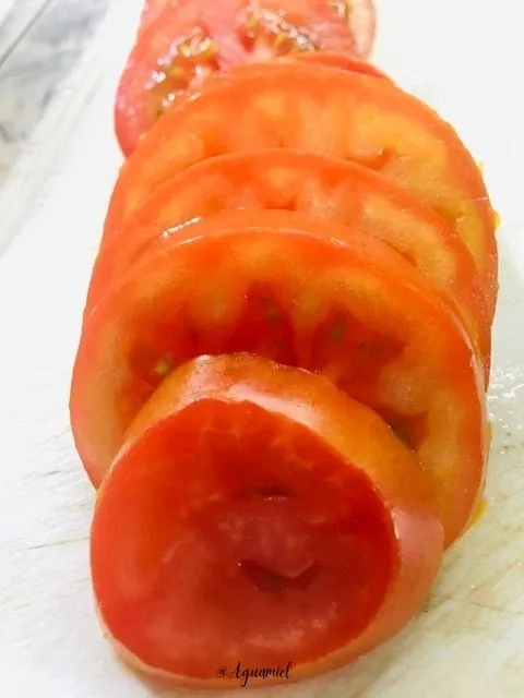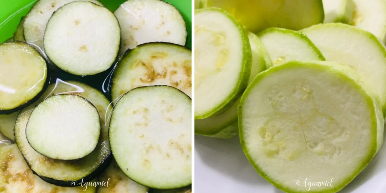 Picamos las berenjenas en circulos, las remojamos con agua y sal para soltar el amargo, el calabacín lo cortamos en circulos y reservamos.