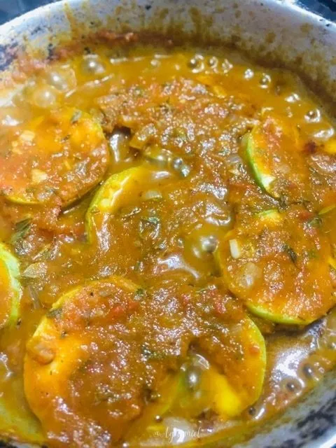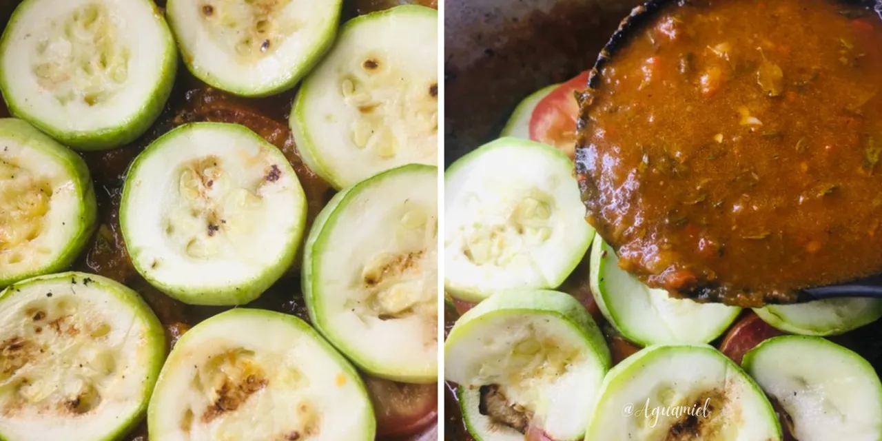 In a cauldron add a little of the sauce and place the eggplants in a circular shape, then the tomatoes and zucchini, add sauce repeating the procedure. We take to medium heat so that the vegetables condense the flavors. Set aside.