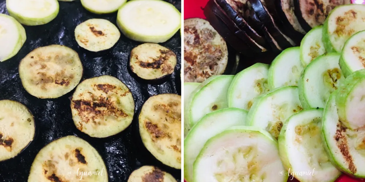 En un plancha o sarten caliente colocamos los calabacines, doramos por ambos lados, repetimos el procedimiento con las berenjenas luego de quitarles el agua de remojo.
