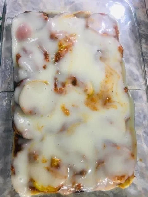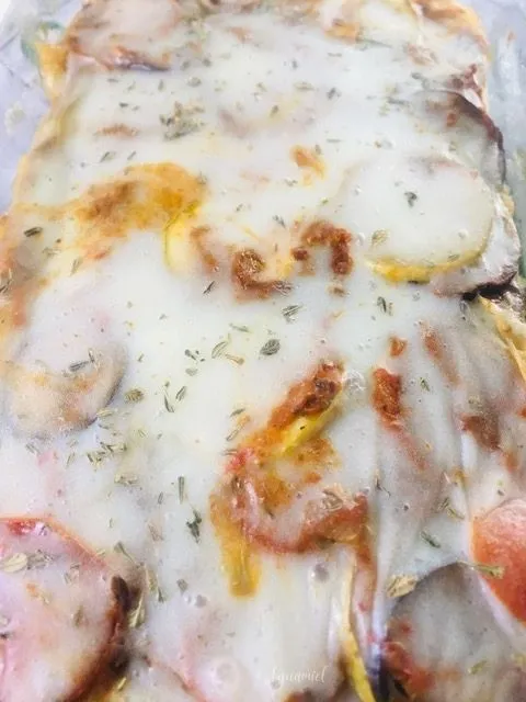 Then cover with the melted potato cheese over the vegetables, and bake in the oven for 15 minutes. I put some oregano on it