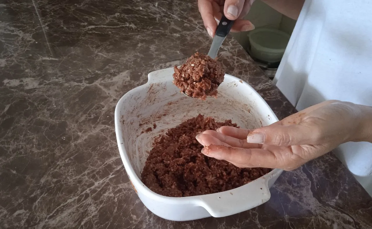 Luego tomo una Cuchara con eso mido el tamaño de las galletas y con las manos le voy dando forma redondeada.