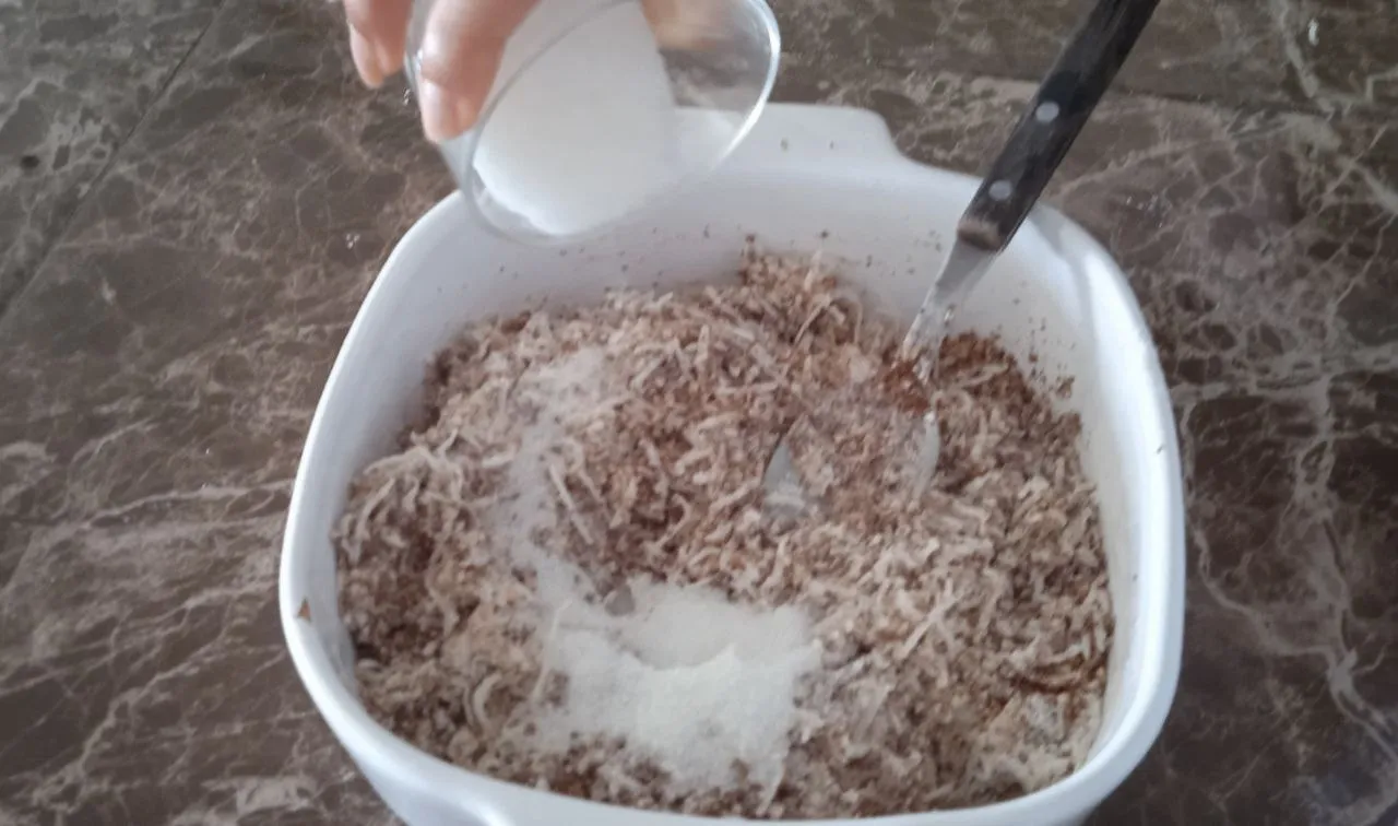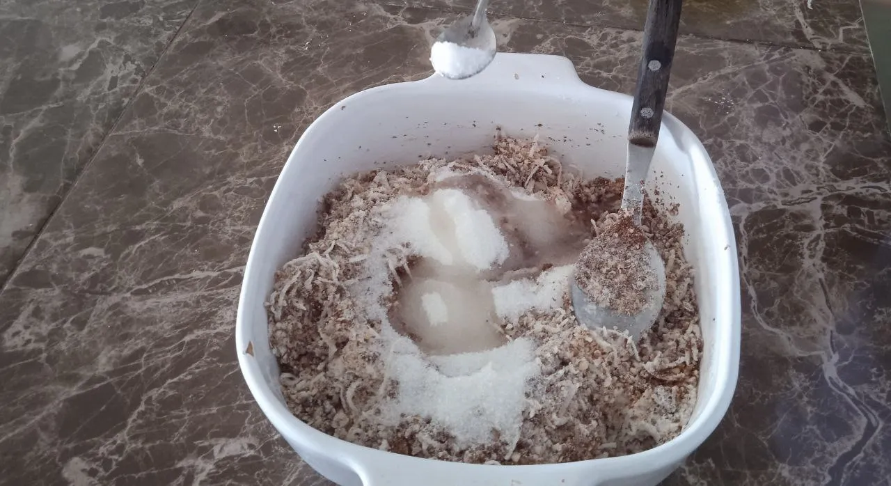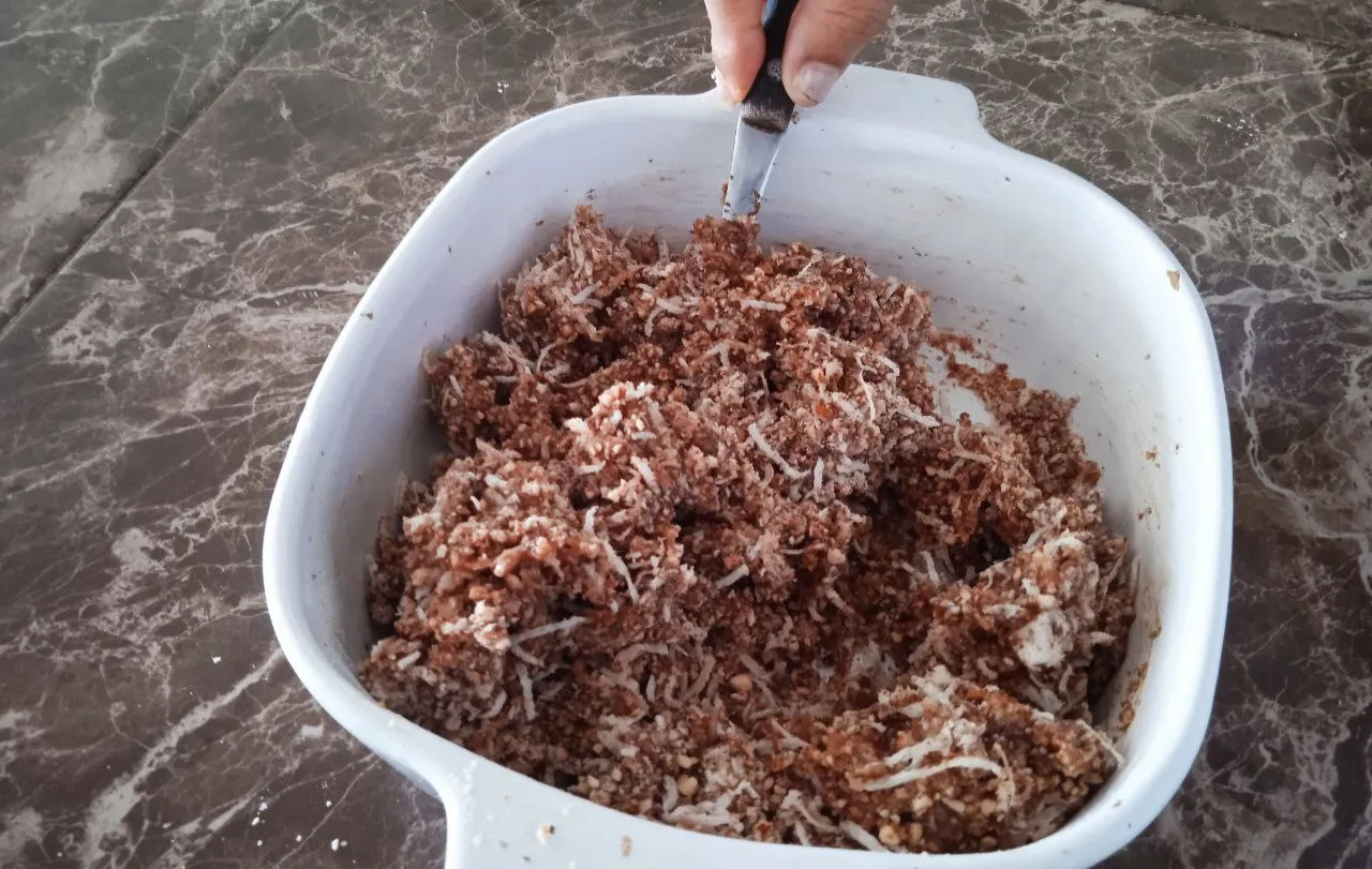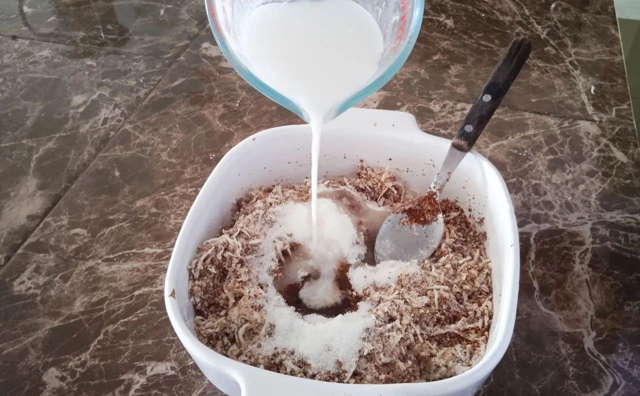 Then add the Coconut Milk, little by little, mixing with a spoon, until our dough has the desired texture, in my case I took it with my hand, I made a ball and I saw that I could do it easily, there I realized that the dough was ready.