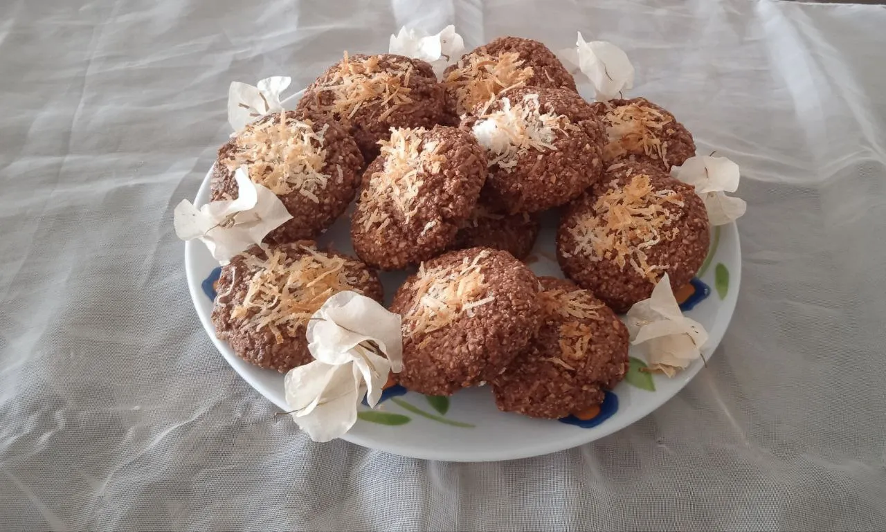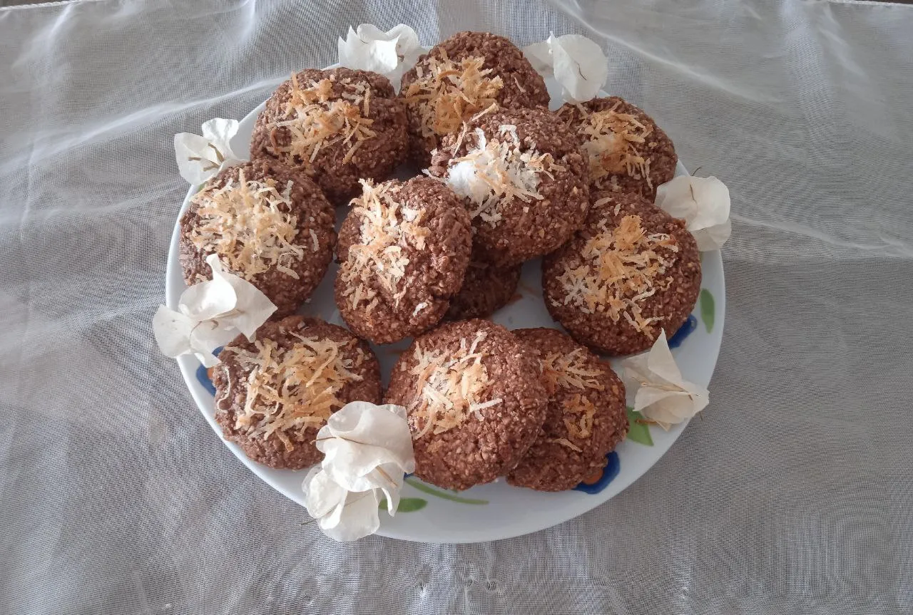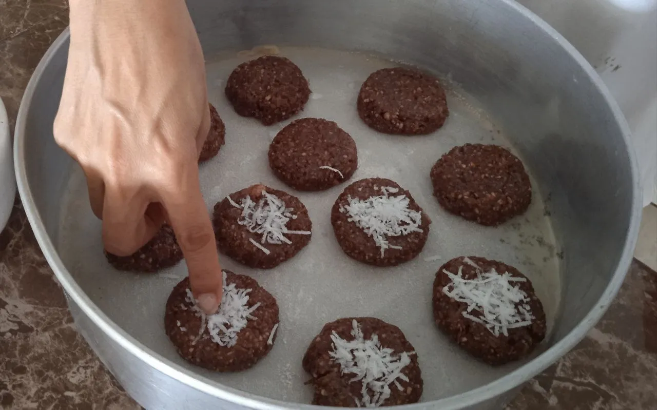 On a floured tray I put my cookies and then decorate them with the grated coconut, pressing a little, so that the coconut sticks to the cookies.