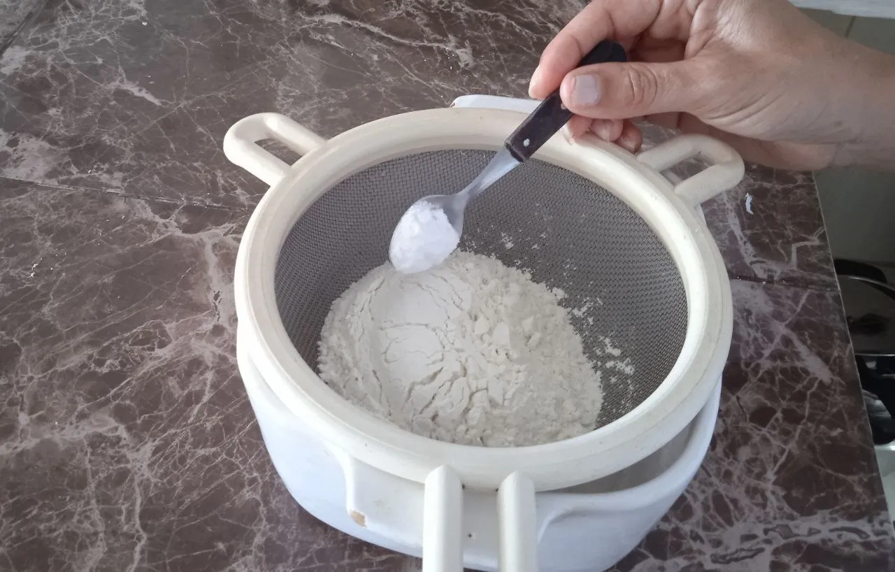 In a bowl we are going to sift the 100 grams of Wheat Flour, together with the teaspoon of Sodium Bicarbonate.