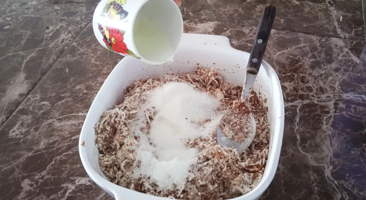 Now add the 3 tablespoons of Coconut Oil, this oil enhances the Coconut flavor of the cookies.