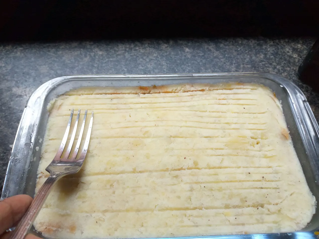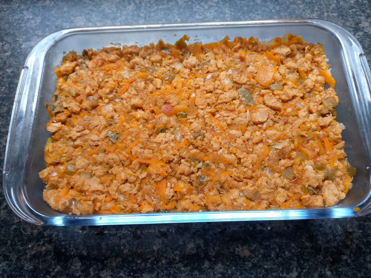 El último paso es armar el pastel colocamos en un refractario colocamos el puré esparcimos, luego agregamos la carne de soya y por último tapamos con una capa de puré con la ayuda de un tenedor le hacemos surcos y le añadimos un chorrito de aceite de oliva metemos al horno previamente precalentado y gratinamos por 30 minutos ya listo retiramos del fuego.