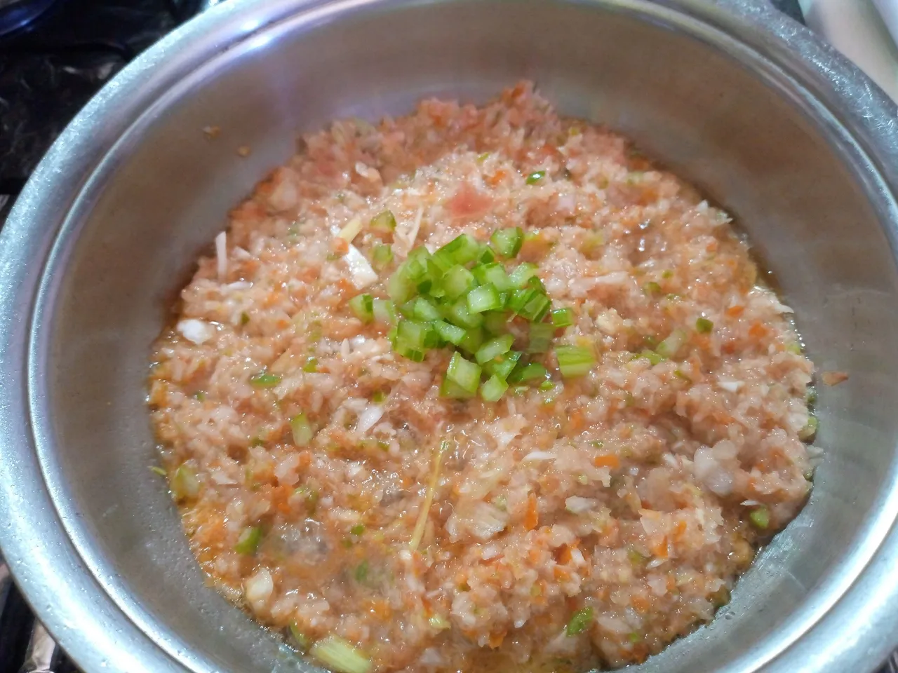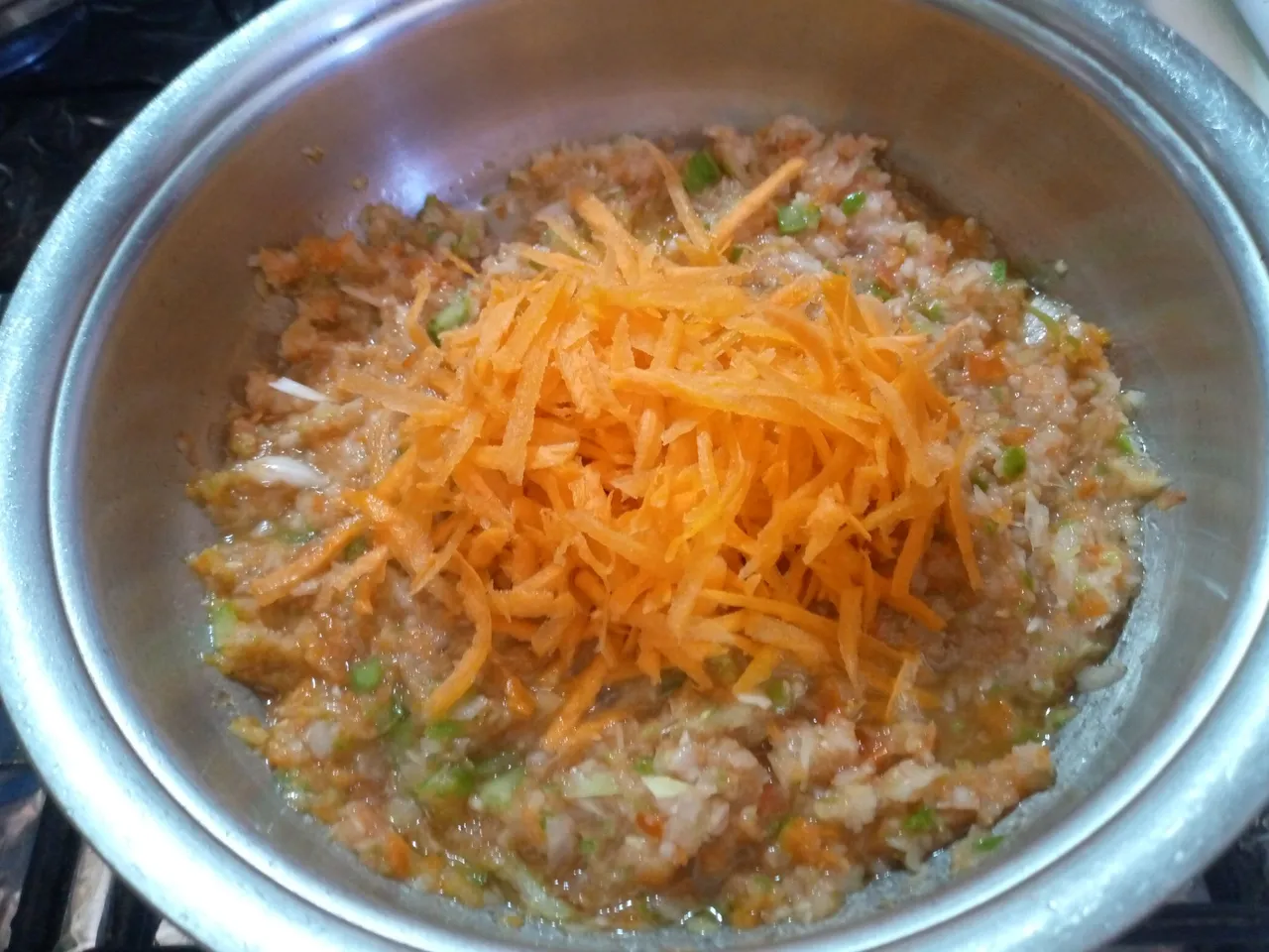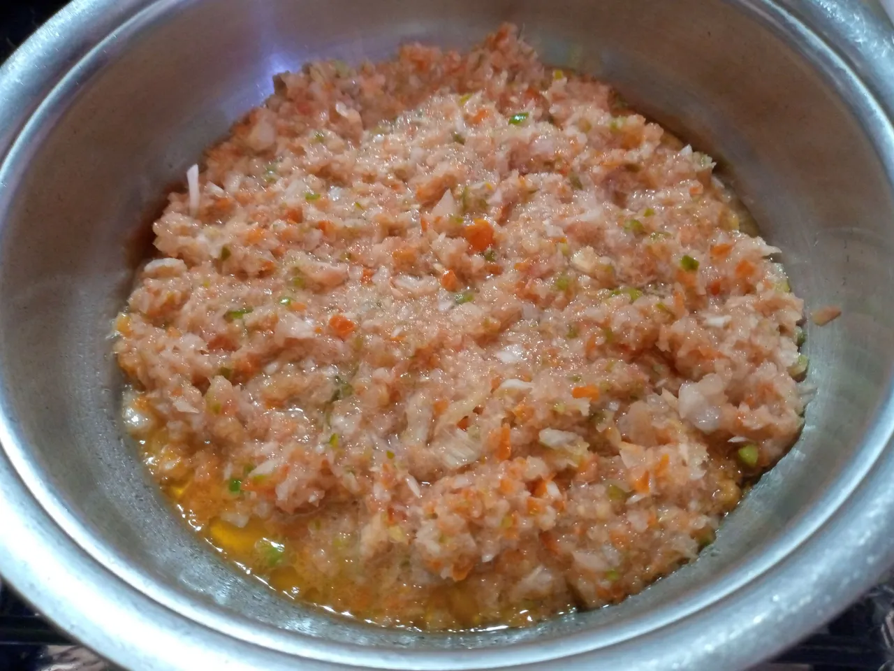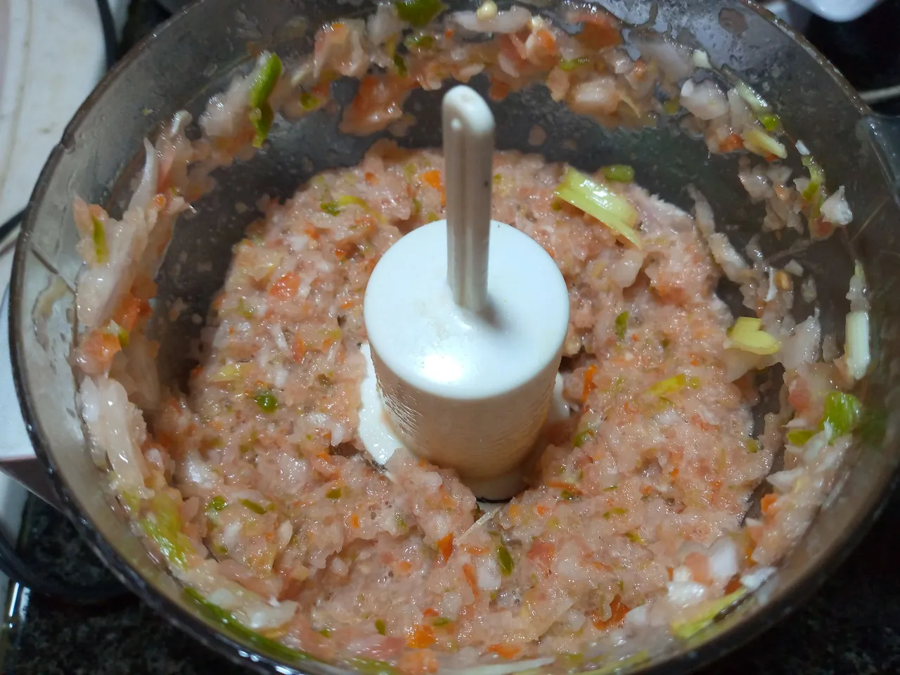 Segundo paso es preparar la carne de soya para ello colocamos en un bol la carne de soya le agregamos agua caliente que las cubra y la dejamos hidratar por 25 minutos, luego la escurrimos para eliminar el agua, lavamos los vegetales que vamos a usar: cebolla, tomate, ajíes, pimentón, ajo porro y ajo y picamos con la ayuda de un procesador de alimento, también las podemos cortar finamente con un cuchillo, rallamos la zanahoria y cortamos en cuadro pequeños el celery.